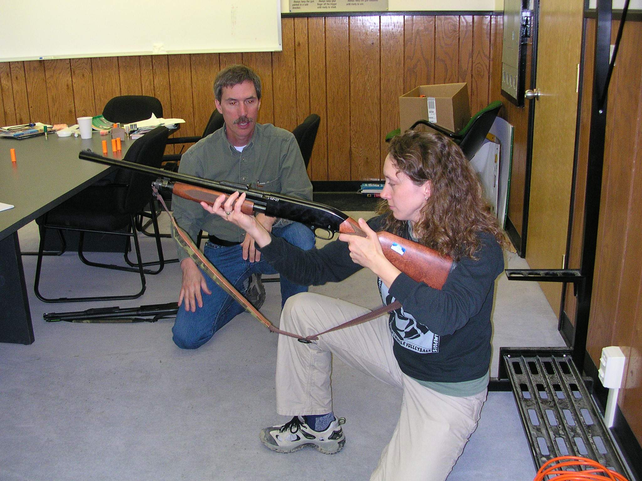 TREC teacher Misty Nikula-Ohlsen practices the kneeling position, while instructor Marris Stuermer, North Slope Borough Deputy Fire Chief, looks on, during gun traing in Barrow, Alaska.