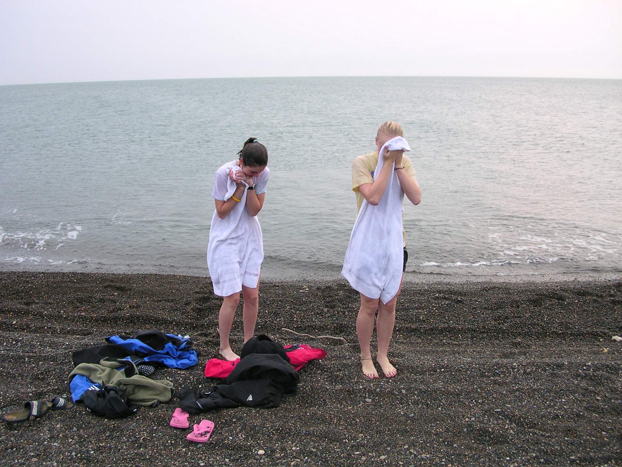 Cate and Rachel, two of TEA teacher Dora Nelson's students, after their Polar Bear swim in the Arctic ocean at Barrow, Alaska.