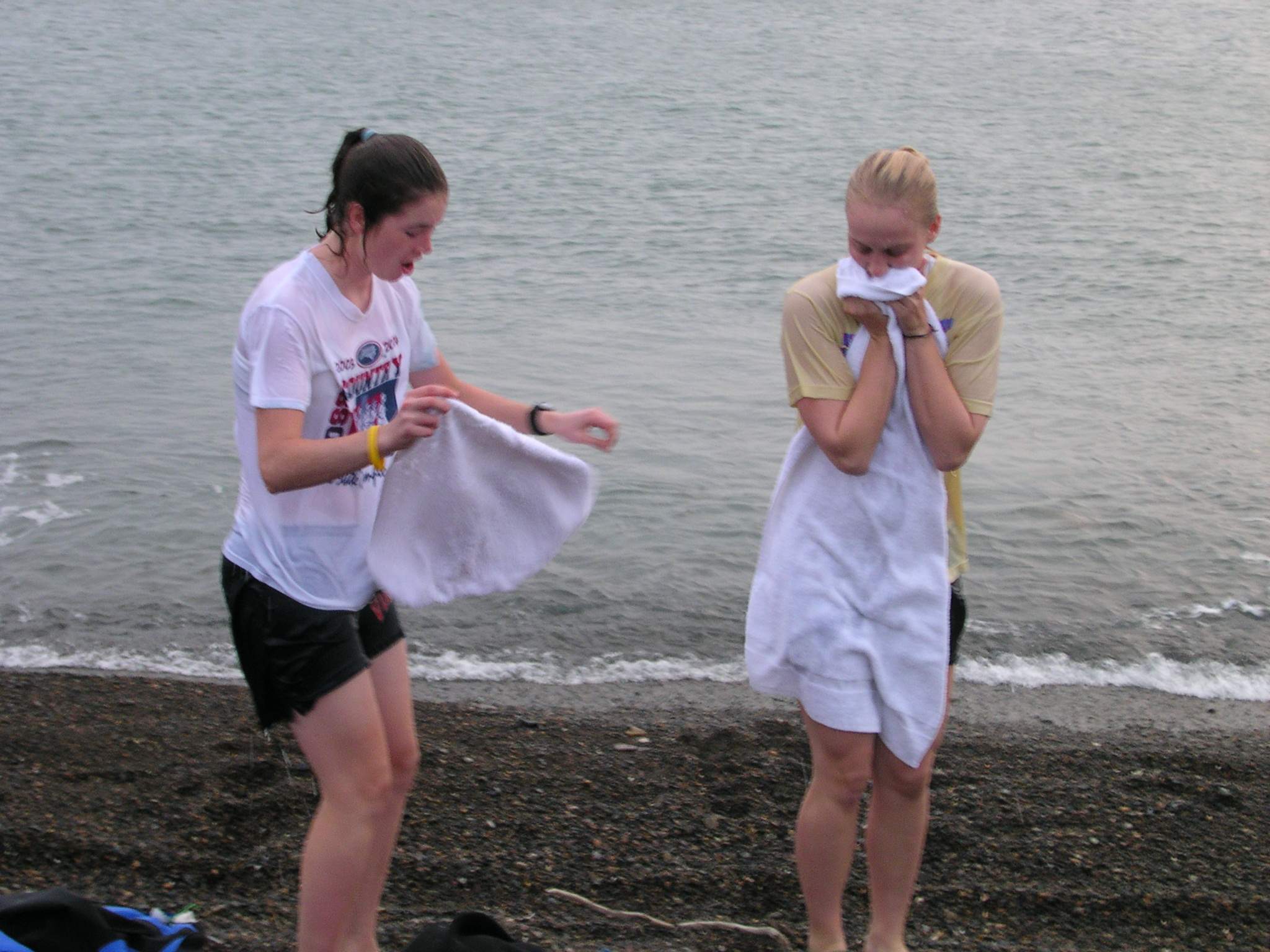 Cate and Rachel, two of TEA teacher Dora Nelson's students, after their Polar Bear swim in the Arctic ocean at Barrow, Alaska.