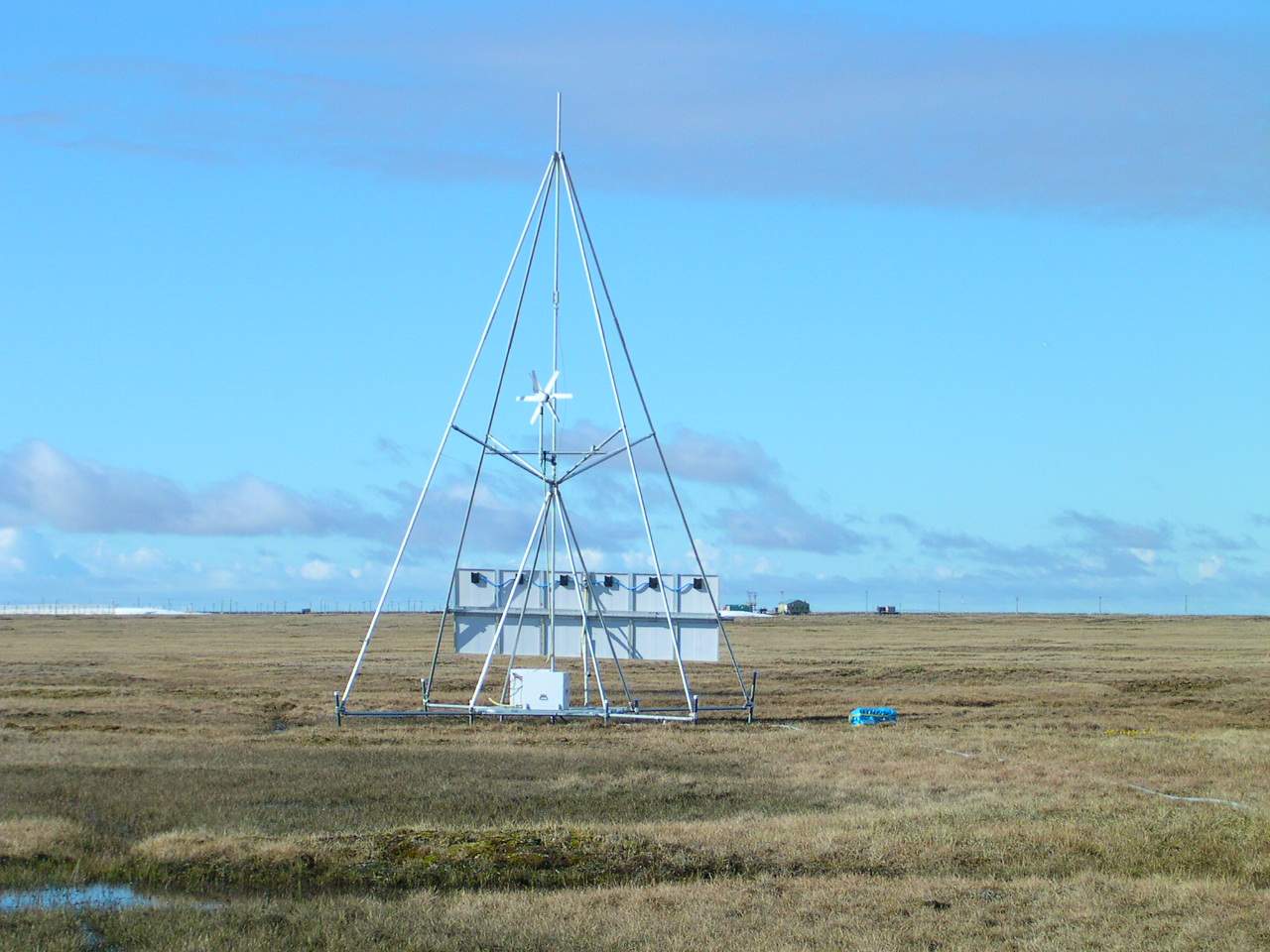 The tower with solar panels that powers the instruments on eddy covariance tower at the Barrow Environmental Observatory (BEO).