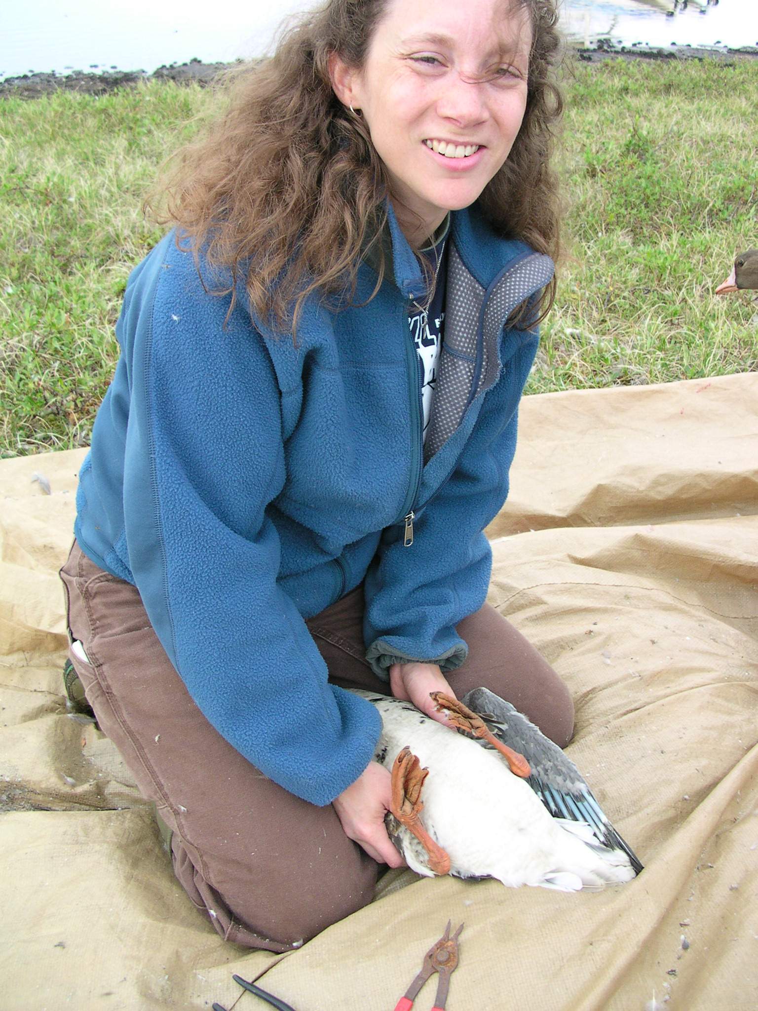 TREC teacher Misty Nikula-Ohlsen banding a snow goose (*Chen caerulescens*) near Barrow, Alaska.
