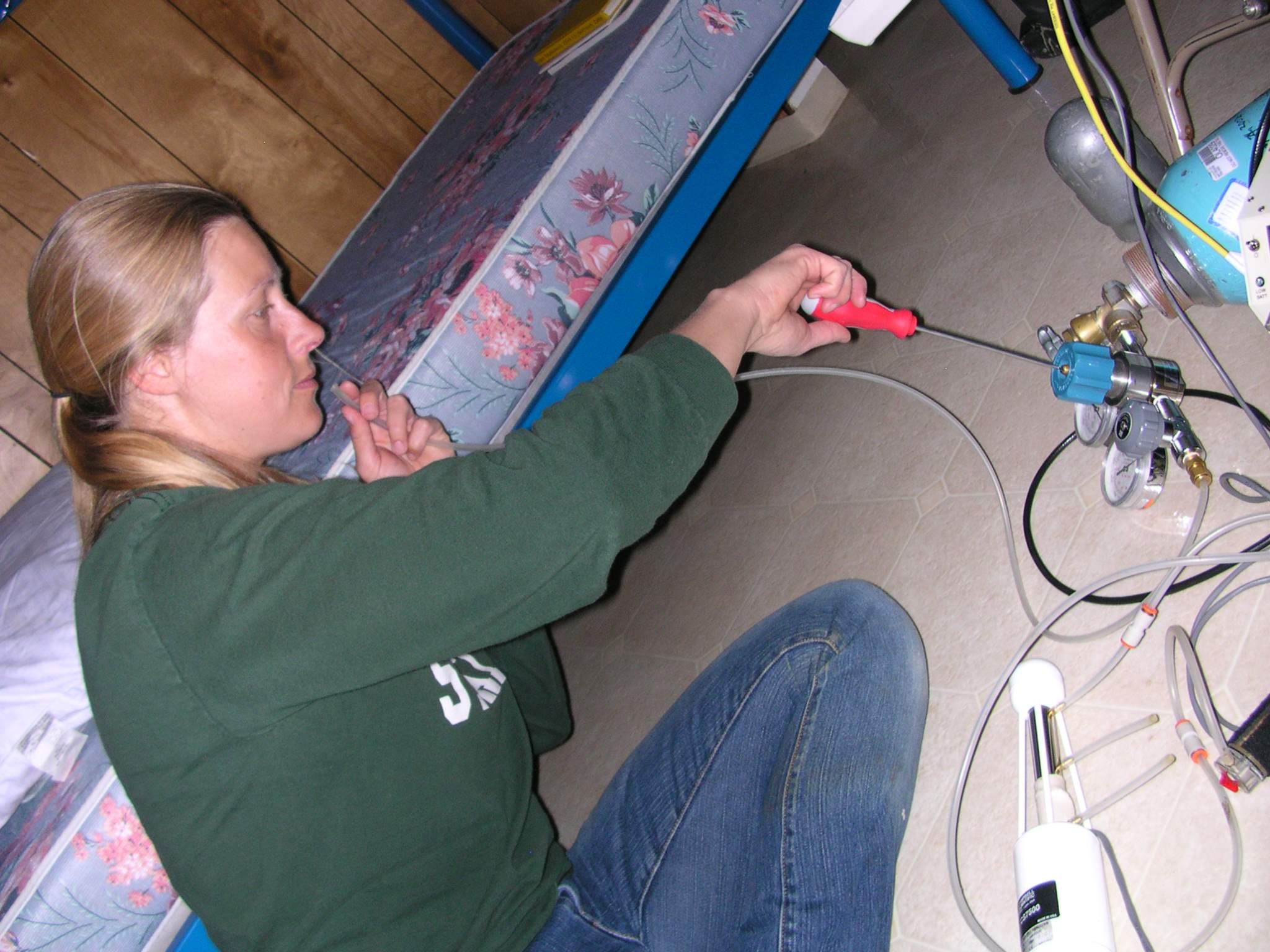 Kirstin Skadberg tests the flow rate during the calibrations of the Infrared Gas Analyzer (IRGA).
