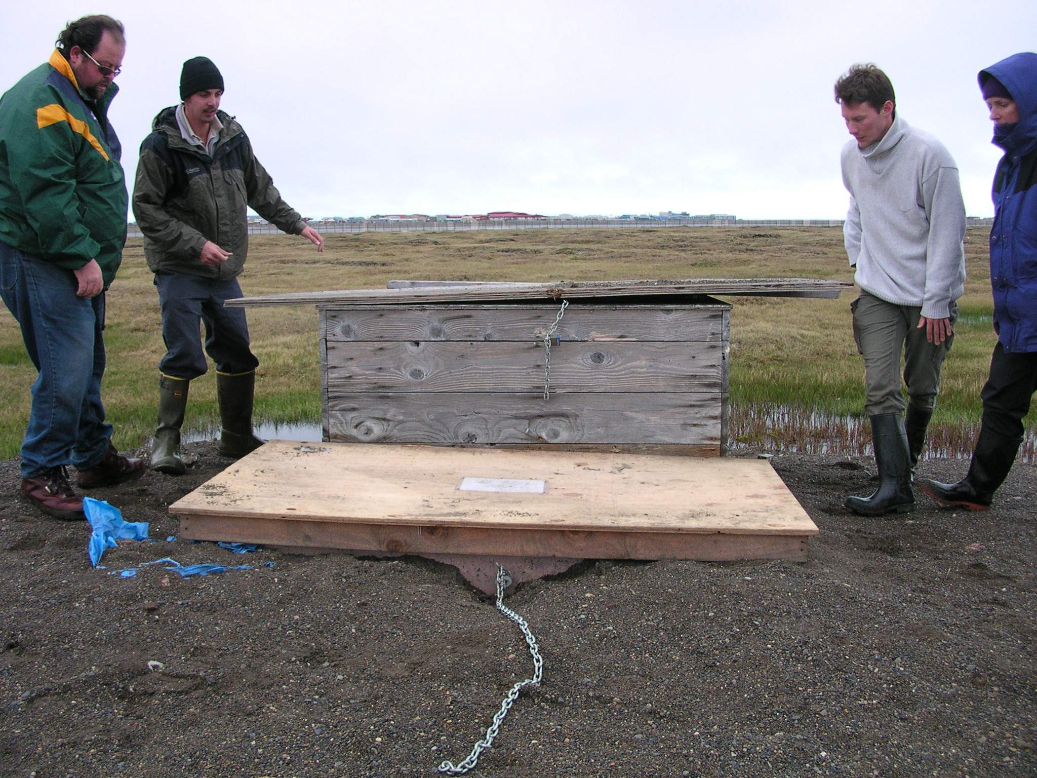The cover to the ice cave, an old ice wedge beneath the tundra that has been excavated, is removed. Taken near Barrow, Alaska.