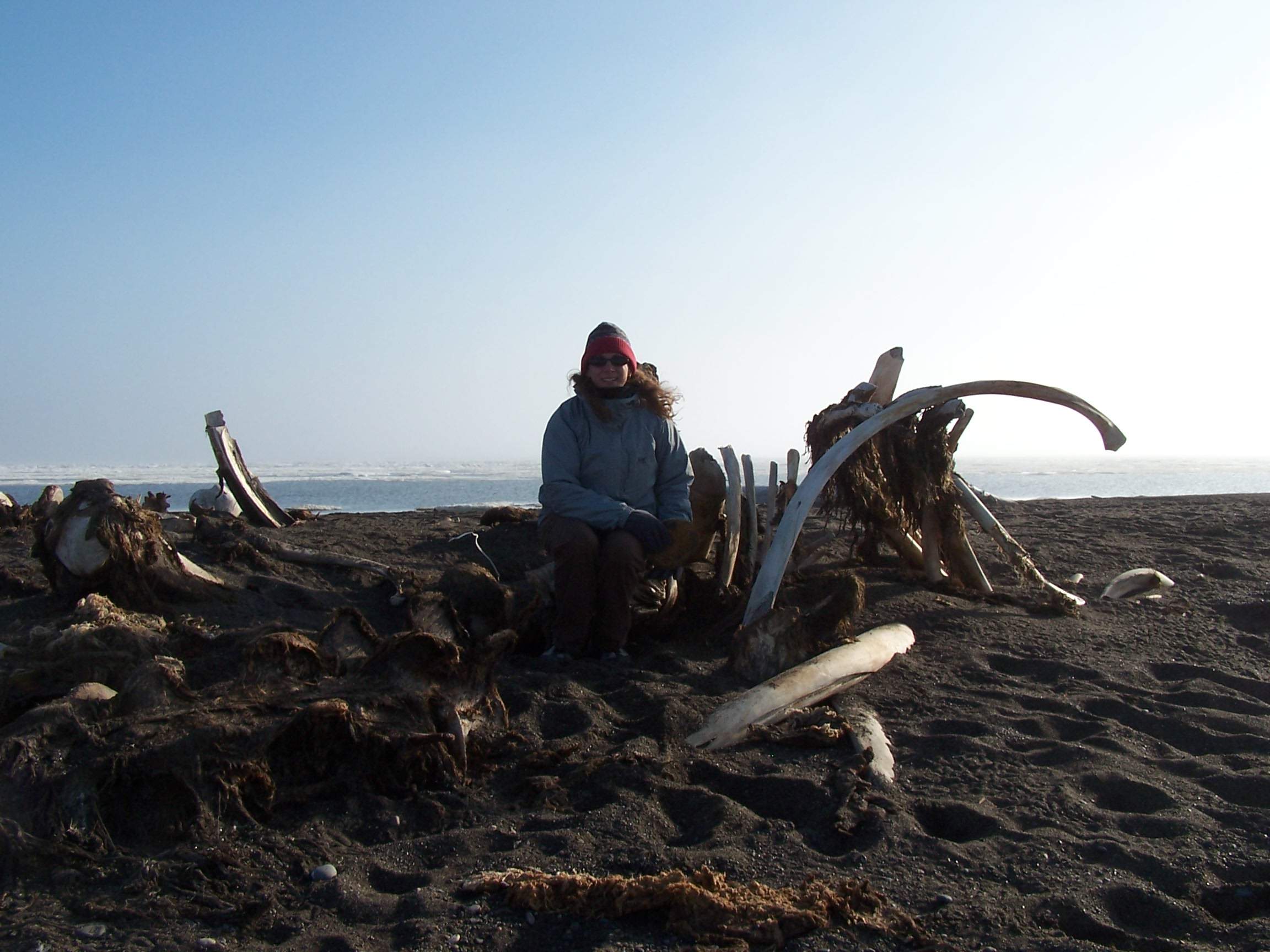 TREC teacher Misty Nikula-Ohlsen and whale bones on the beach near Point Barrow, Alaska.