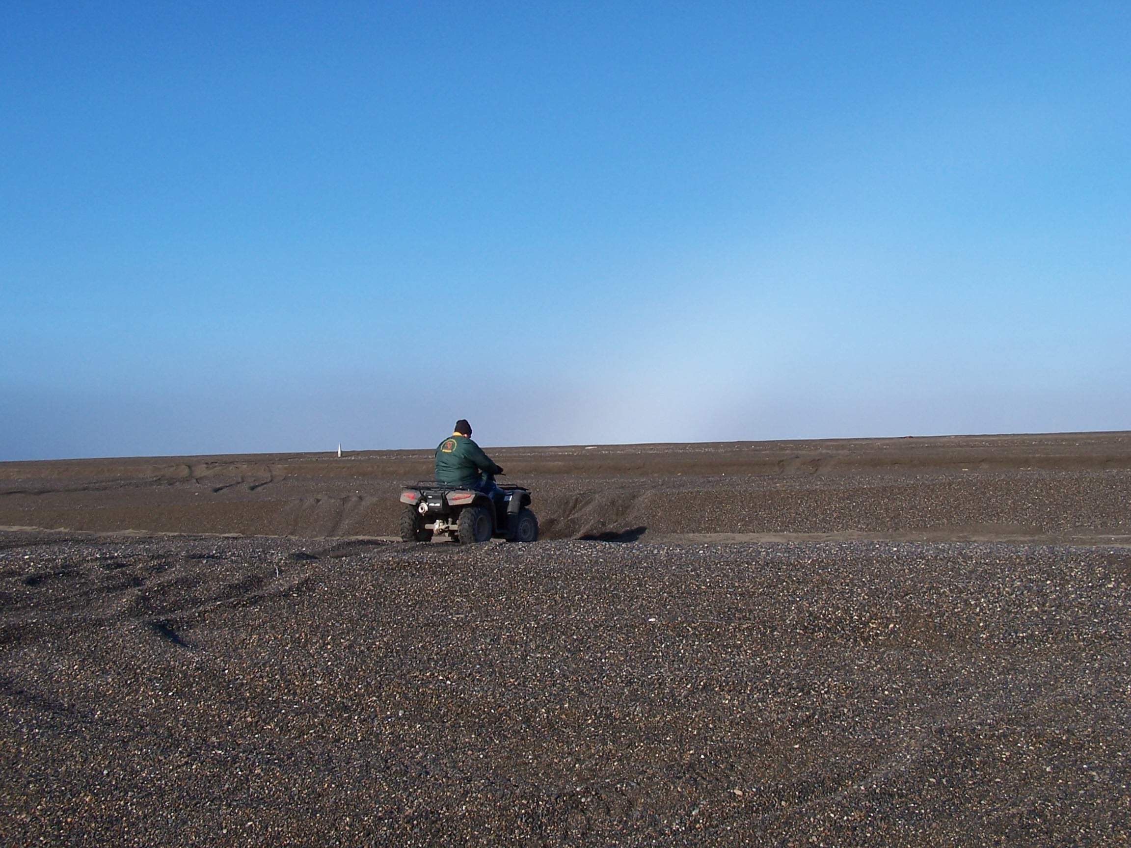 Dave Hobby of Aerosonde has his 4wheelers stuck in the sand on the beach near Barrow, Alaska.