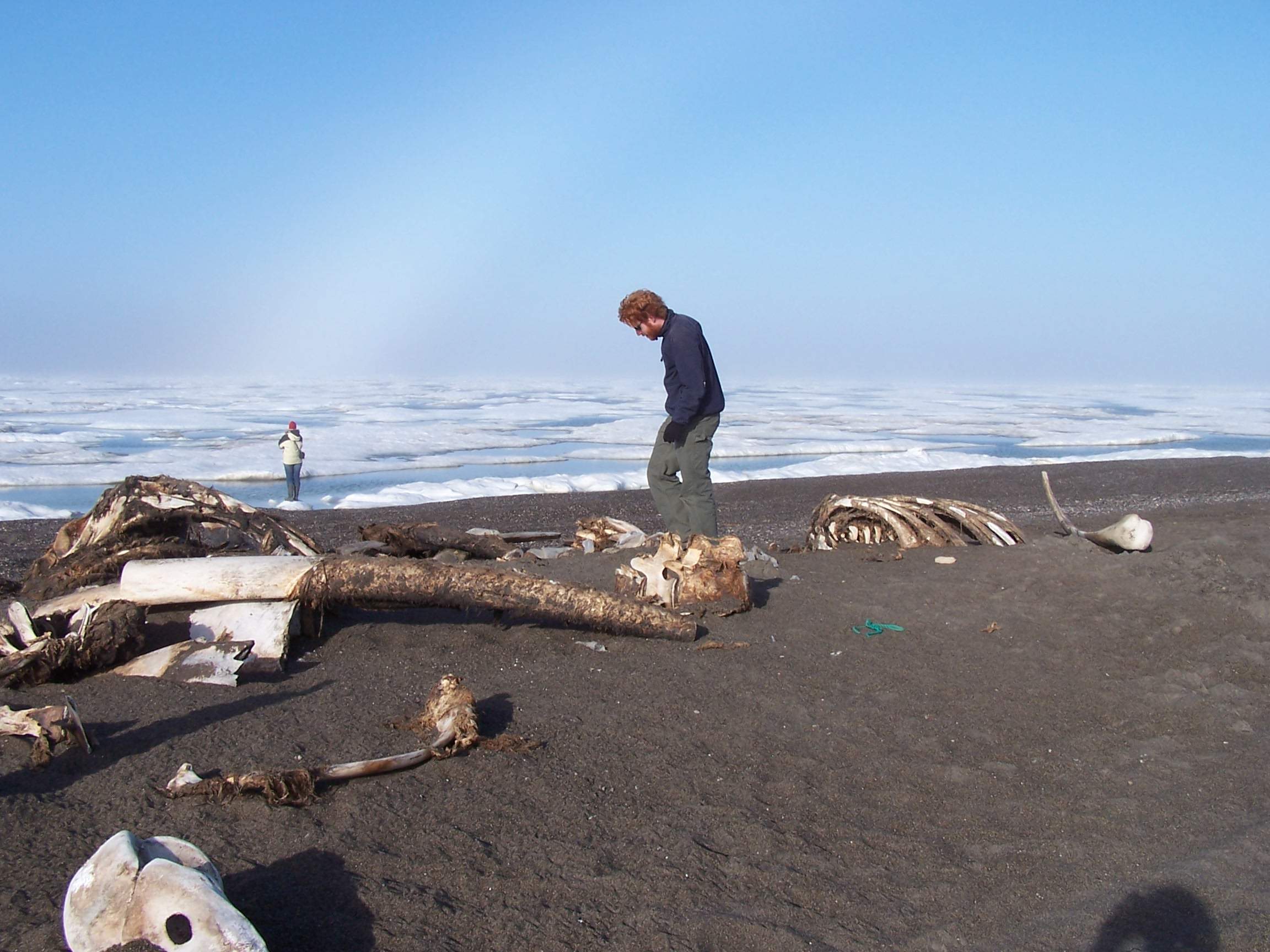 Danile Fowler of Aerosonde strolls among some whale bones on the beach near Barrow, Alaska