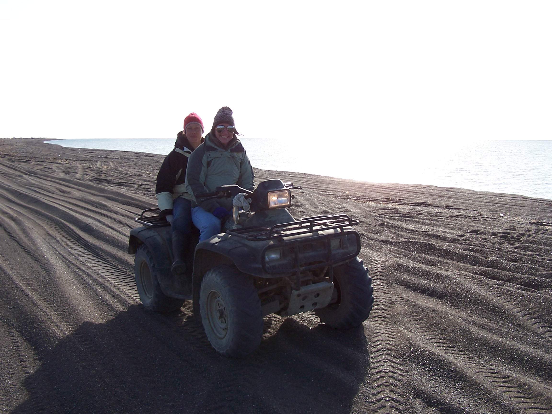 Brenda Mulac and Kirstin Skadberg ride a 4Wheeler on the beach near Barrow, Alaska.