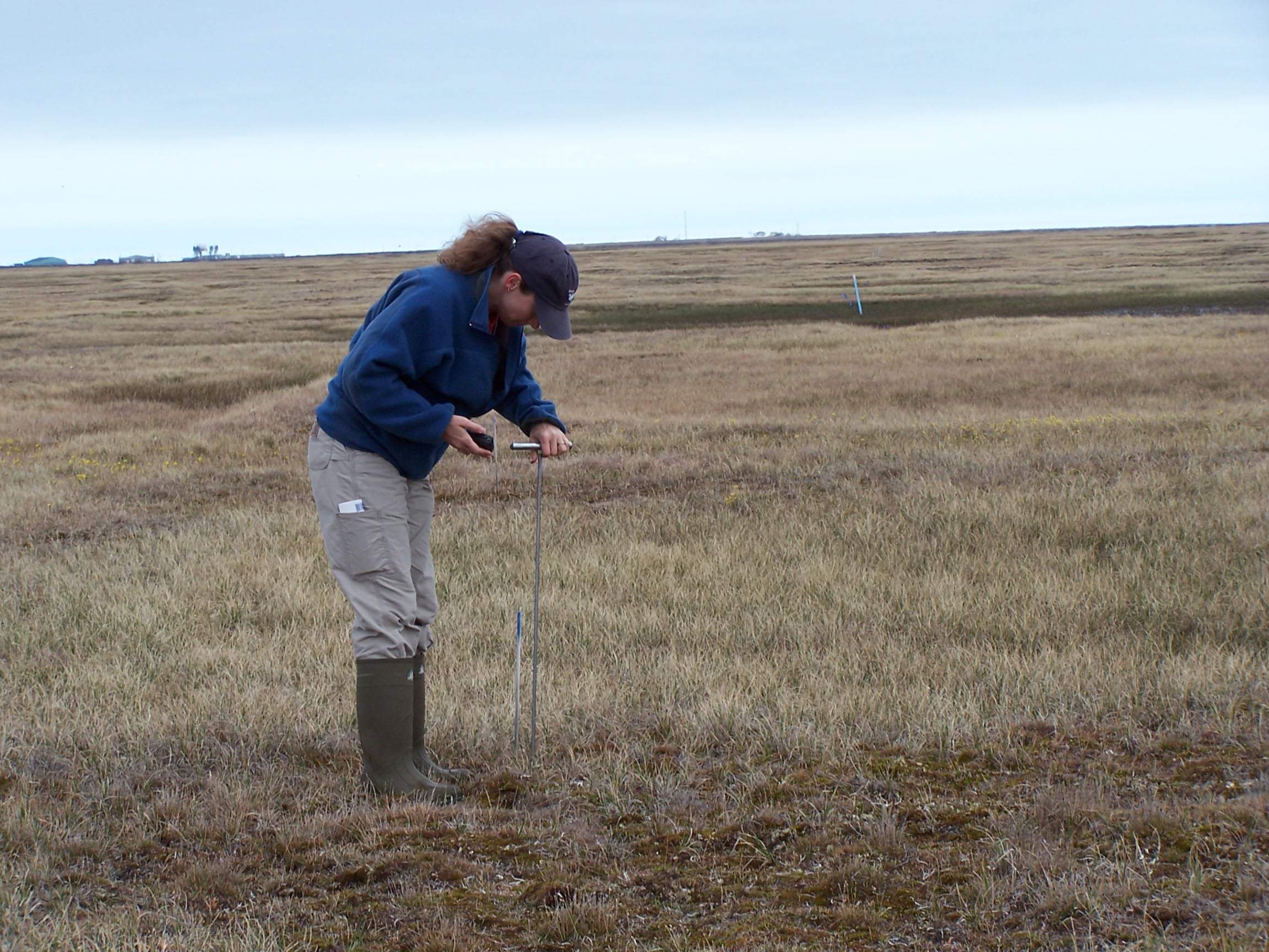 TREC teacher Misty Nikula-Ohlsen probes the soil and takes measurements at the Barrow Environmental Observatory.