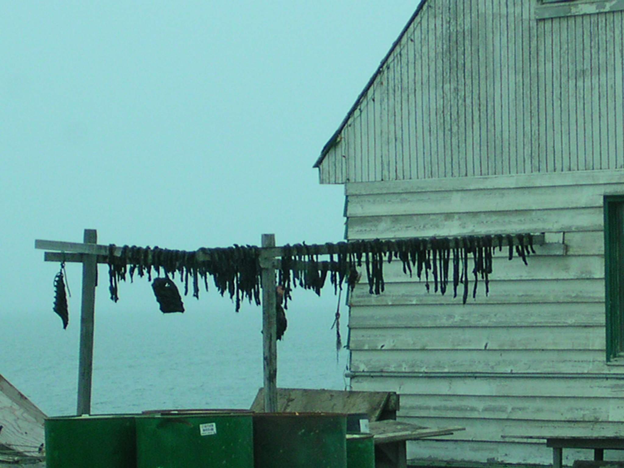 A house in Barrow, Alaska with drying caribou meet outside on racks.