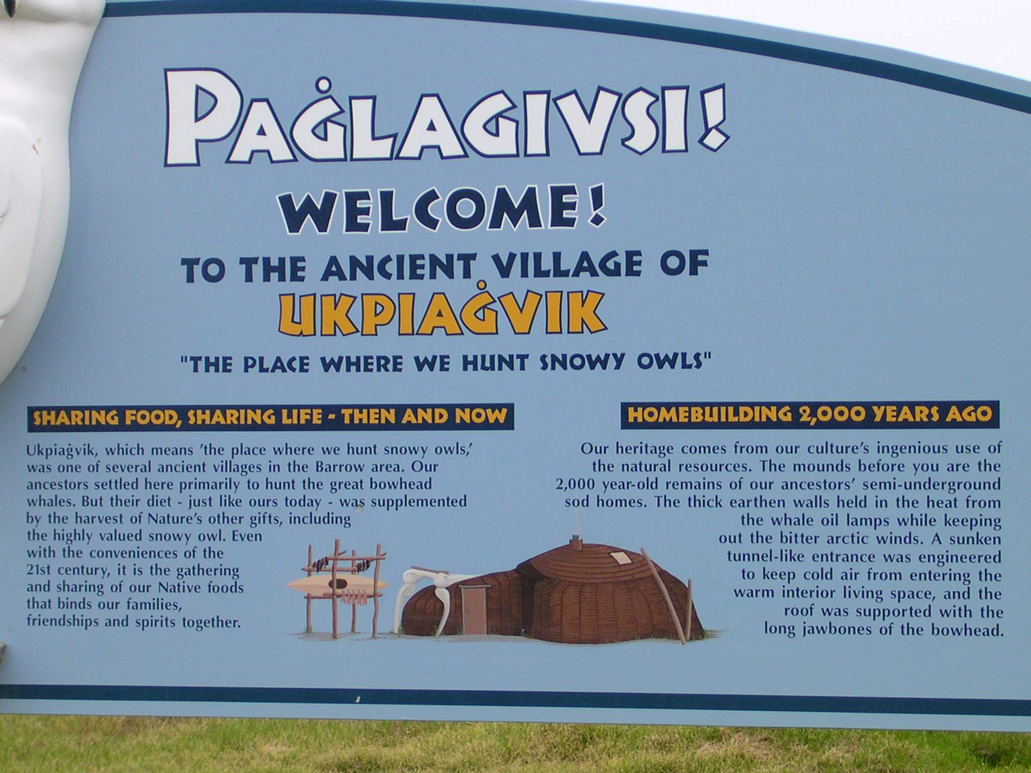 The welcome sign for the village of Ukplagvik located near Barrow, Alaska.