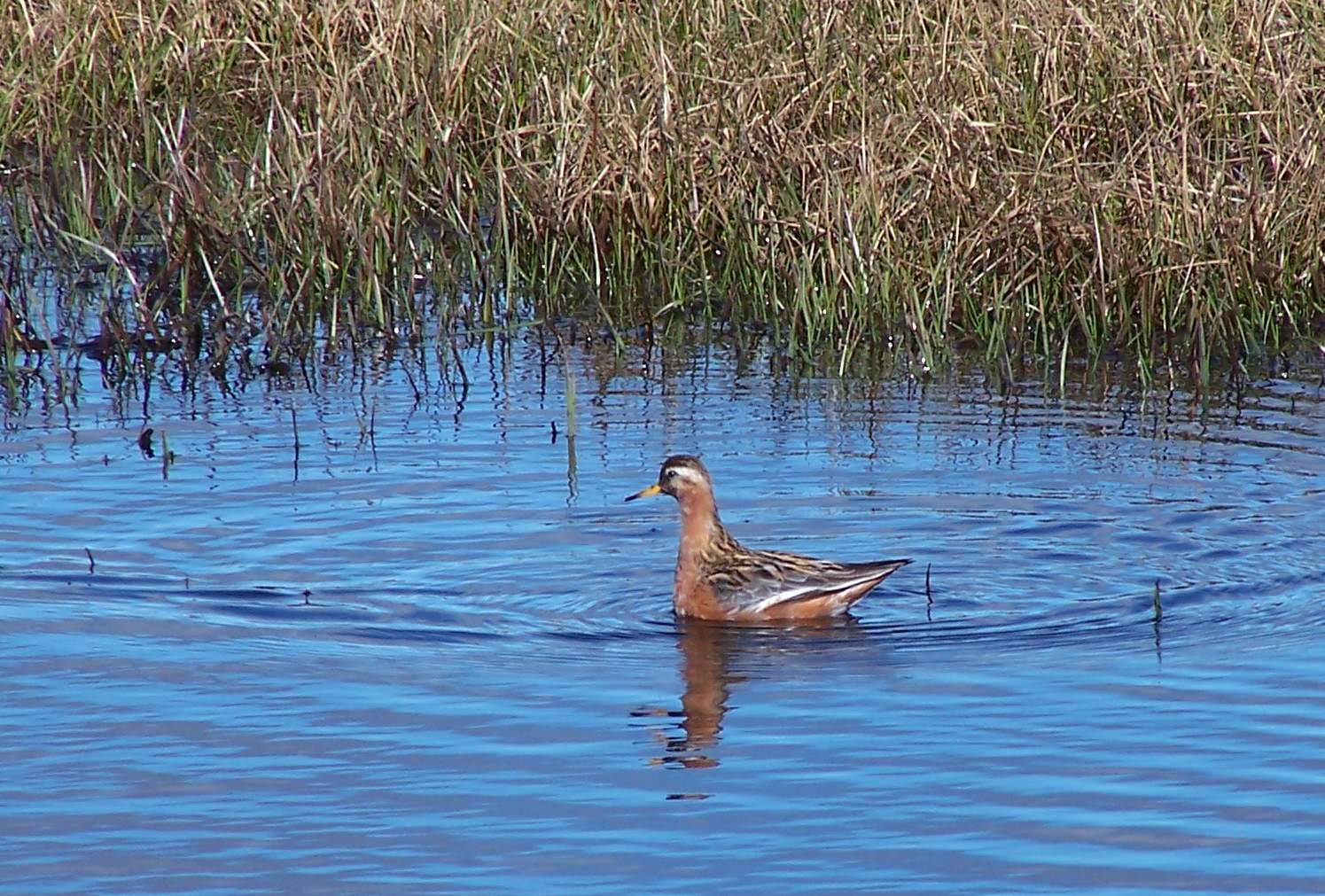 A red phalarope (*Phalaropus fulicaria*) paddles in a pond near Barrow, Alaska.