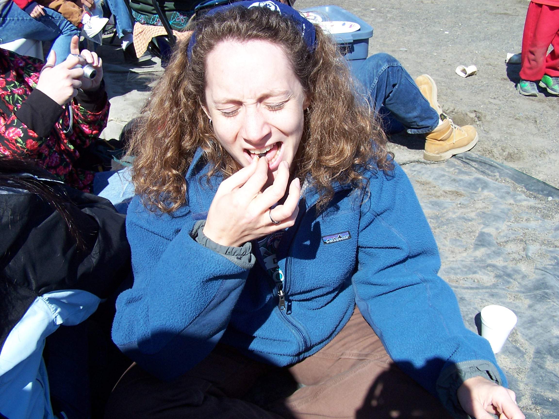 TREC teacher Misty Nikula-Ohlsen tries mikiaq at the Nalukataq, the annual outdoor festival, where each whaling crew that caught a whale the past spring serves a “banquet” of Native food to everyone who comes. Barrow, Alaska.