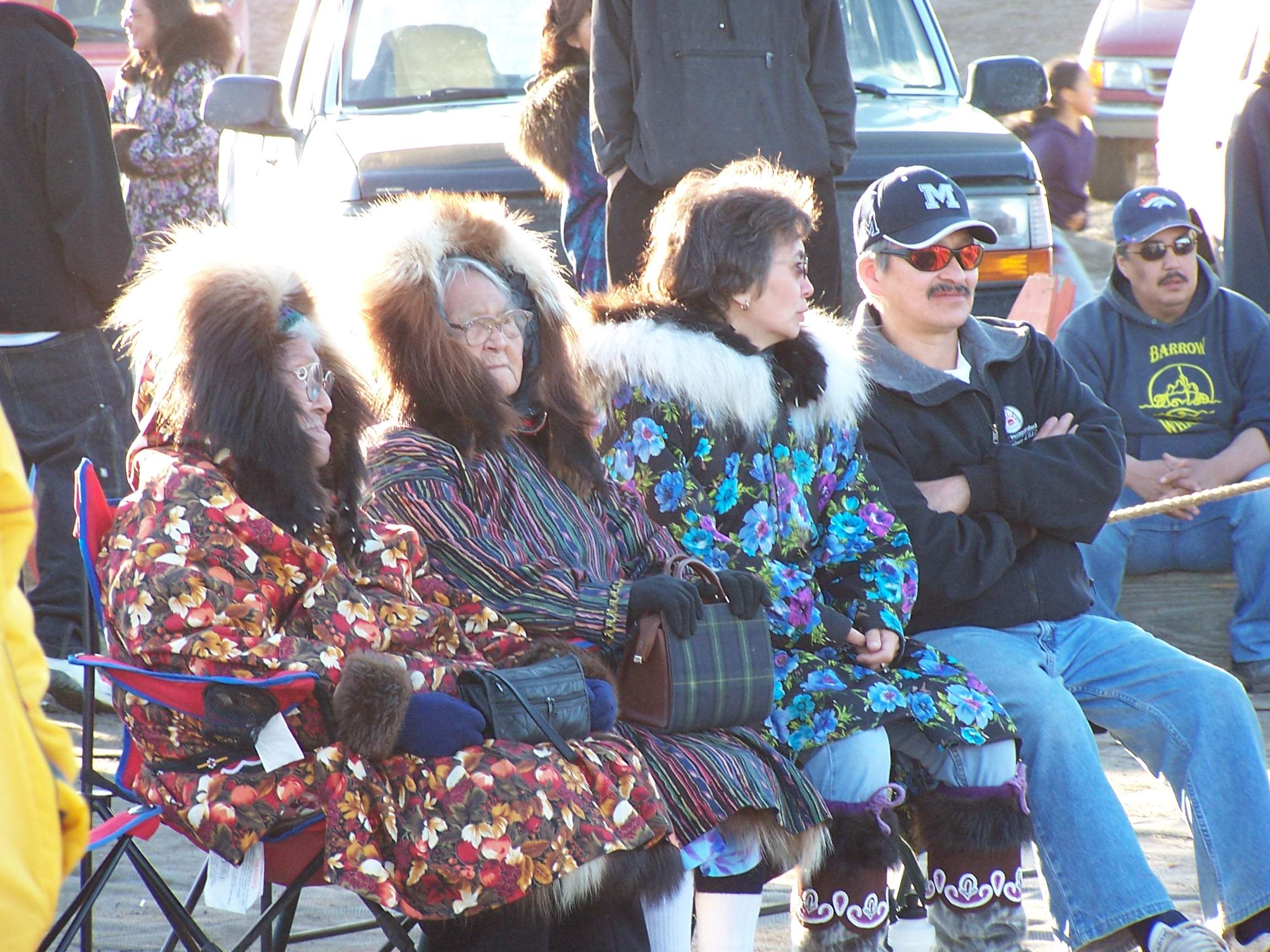 Inupiaq elders watching the festivities at the Nalukataq, the annual outdoor festival, where each whaling crew that caught a whale the past spring serves a “banquet” of Native food to everyone who comes. Barrow, Alaska.