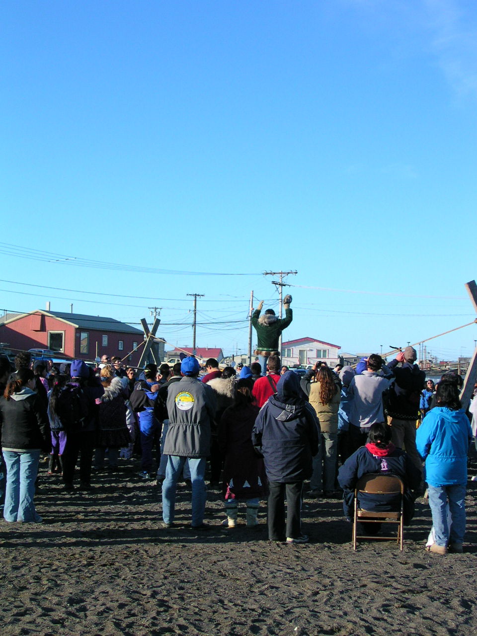 Gary, a Barrow local, gets ready to be tossed during the blanket toss at the Nalukataq, the annual outdoor festival, where each whaling crew that caught a whale the past spring serves a “banquet” of Native food to everyone who comes. Barrow, Alaska.