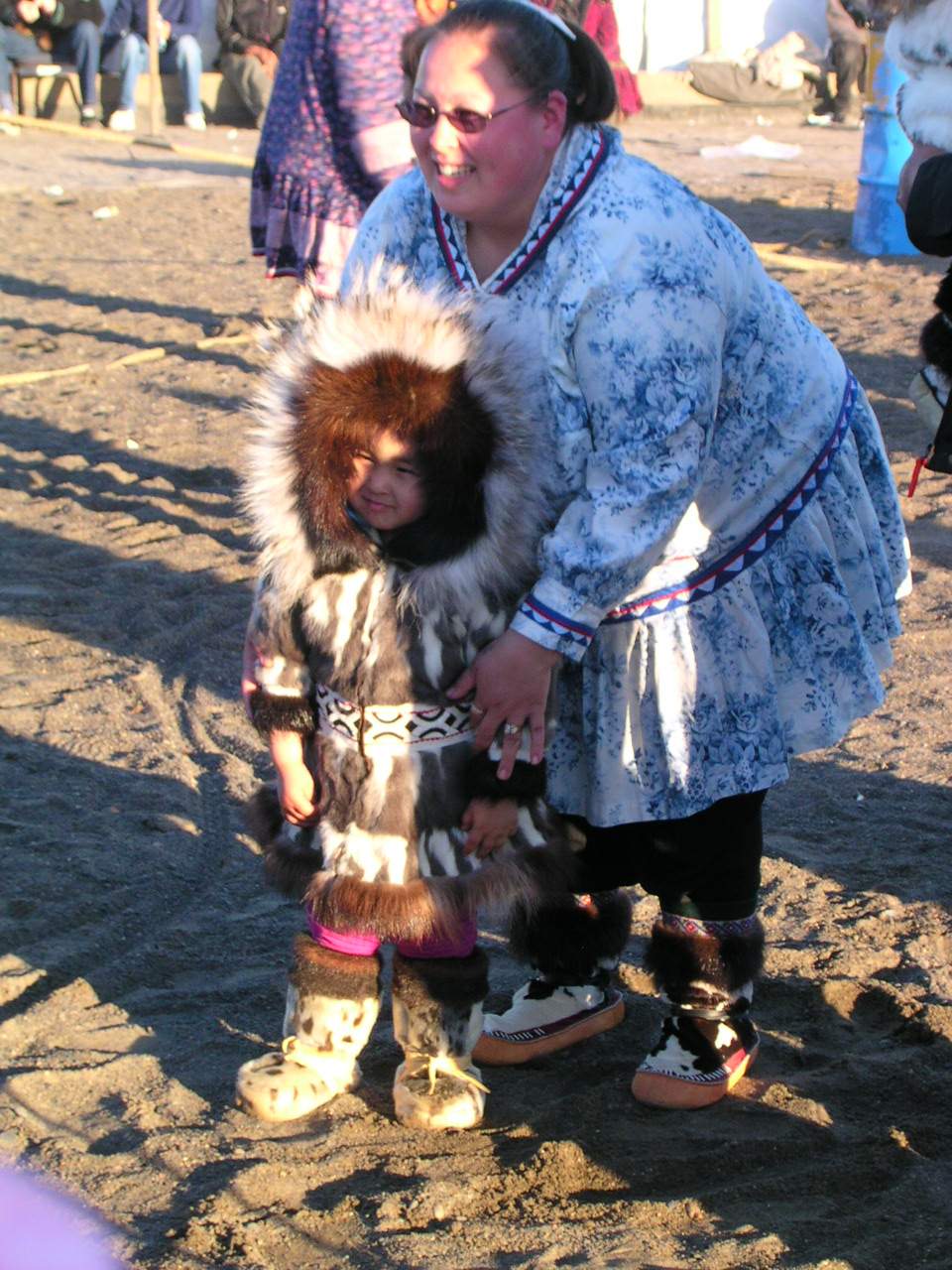 A girl in a fur parka at the Nalukataq, the annual outdoor festival, where each whaling crew that caught a whale the past spring serves a “banquet” of Native food to everyone who comes. Barrow, Alaska.