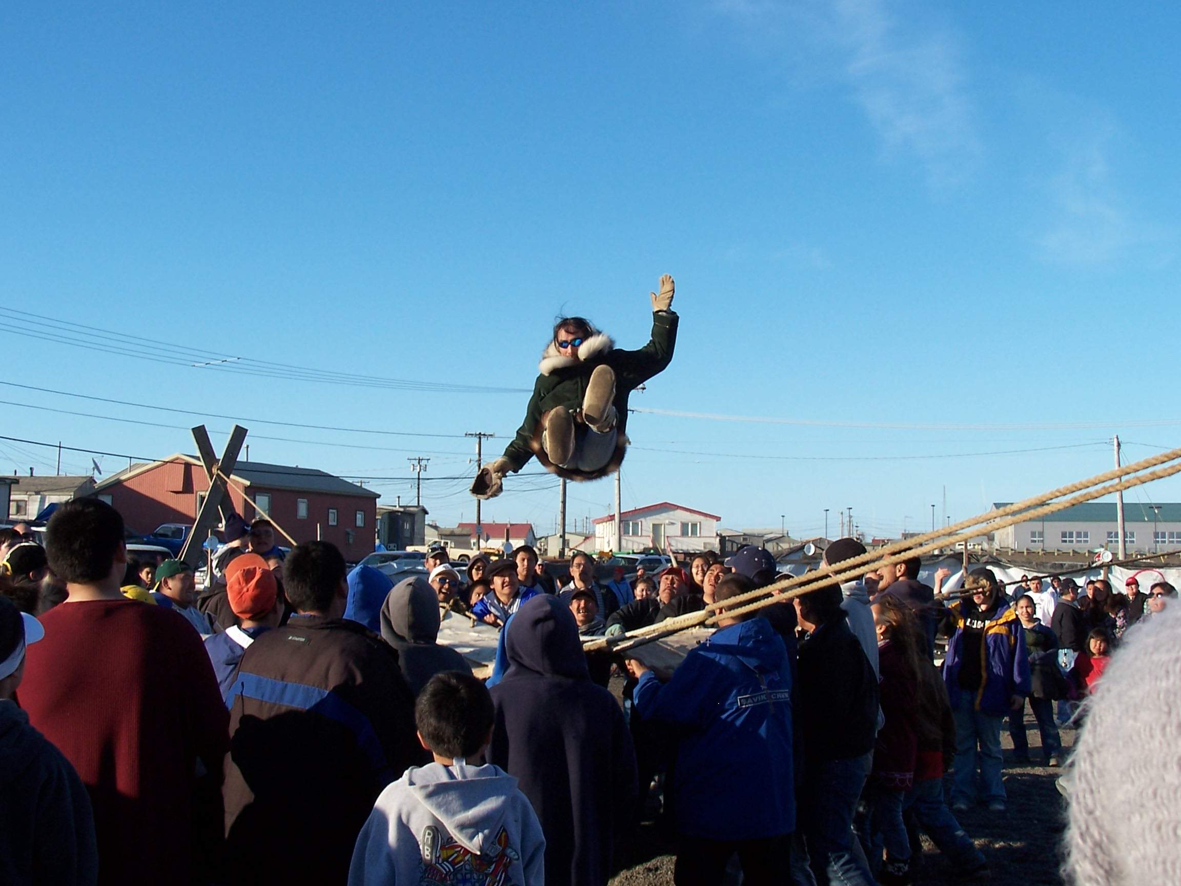 Gary, a Barrow local, being tossed during the blanket toss at the Nalukataq, the annual outdoor festival, where each whaling crew that caught a whale the past spring serves a “banquet” of Native food to everyone who comes. Barrow, Alaska.