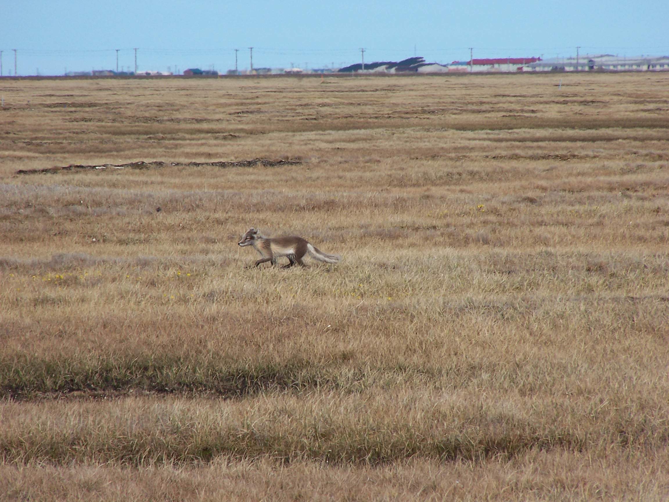An arctic fox (*Alopex lagopus*) on the tundra at the Barrow Environmental Observatory (BEO) near Barrow, Alaska.