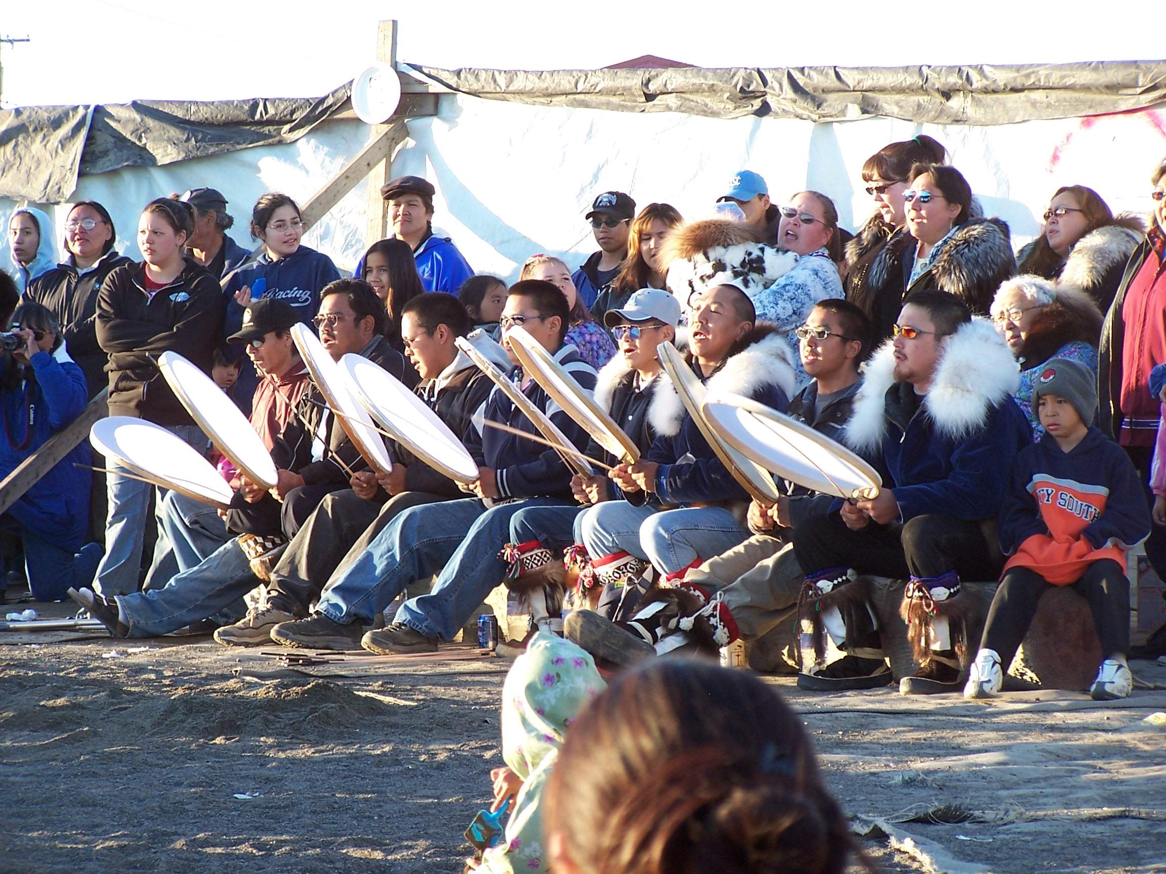 Drummers and singers perform at the Nalukataq, the annual outdoor festival, where each whaling crew that caught a whale the past spring serves a “banquet” of Native food to everyone who comes. Barrow, Alaska.