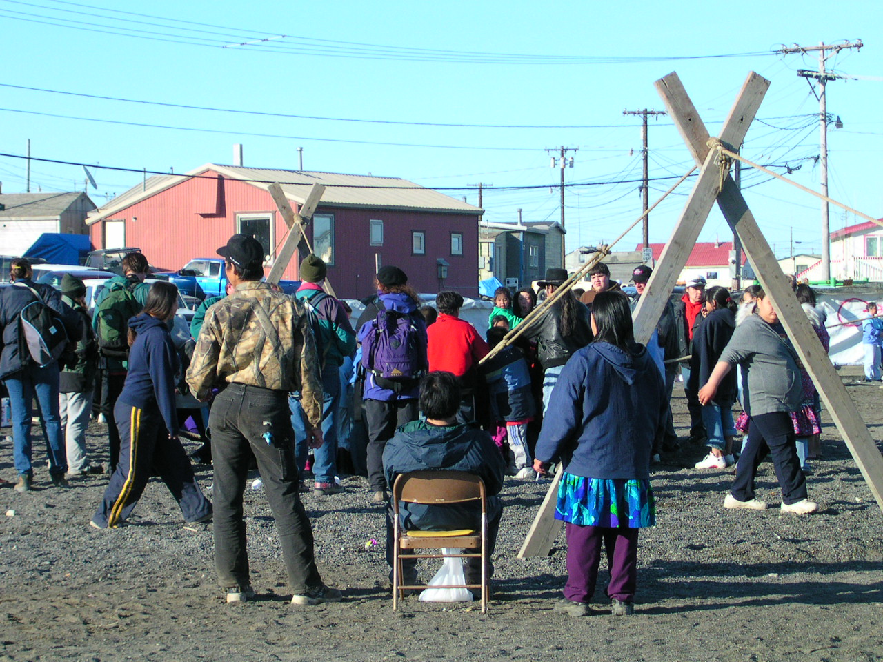 Local Barrow children on a low blanket practicing their blanket toss at the Nalukataq, the annual outdoor festival, where each whaling crew that caught a whale the past spring serves a “banquet” of Native food to everyone who comes. Barrow, Alaska.