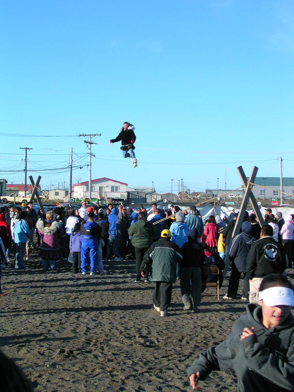 A local Barrow man flies high during the blanket toss at the Nalukataq, the annual outdoor festival, where each whaling crew that caught a whale the past spring serves a “banquet” of Native food to everyone who comes. Barrow, Alaska.