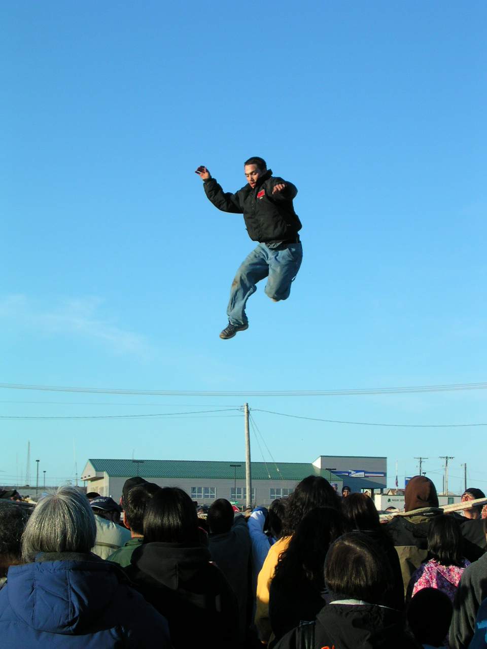 A local Barrow man does a black flip during the blanket toss at the Nalukataq, the annual outdoor festival, where each whaling crew that caught a whale the past spring serves a “banquet” of Native food to everyone who comes. Barrow, Alaska.