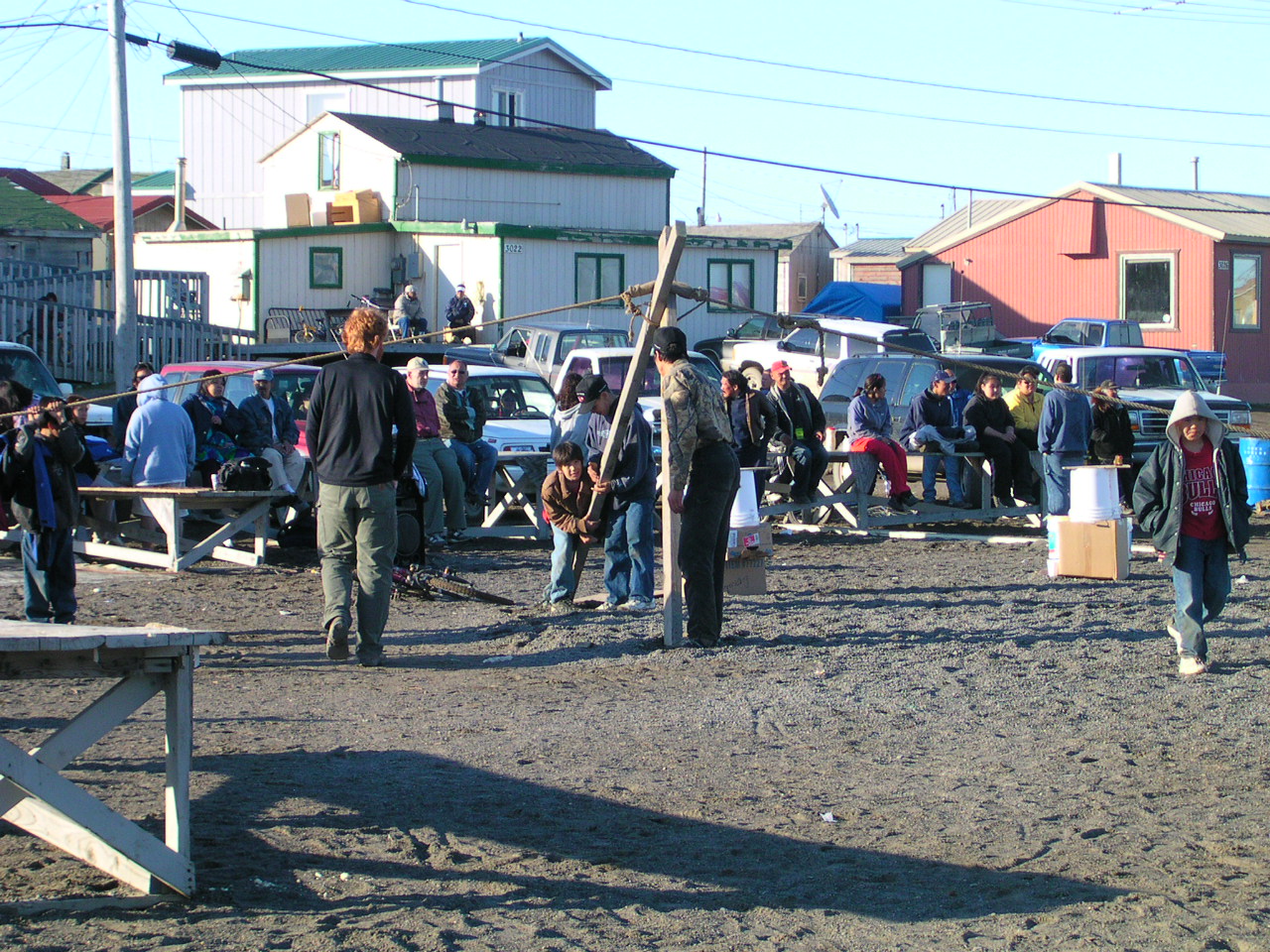 Adjusting poles at the Nalukataq, the annual outdoor festival, where each whaling crew that caught a whale the past spring serves a “banquet” of Native food to everyone who comes. Barrow, Alaska.