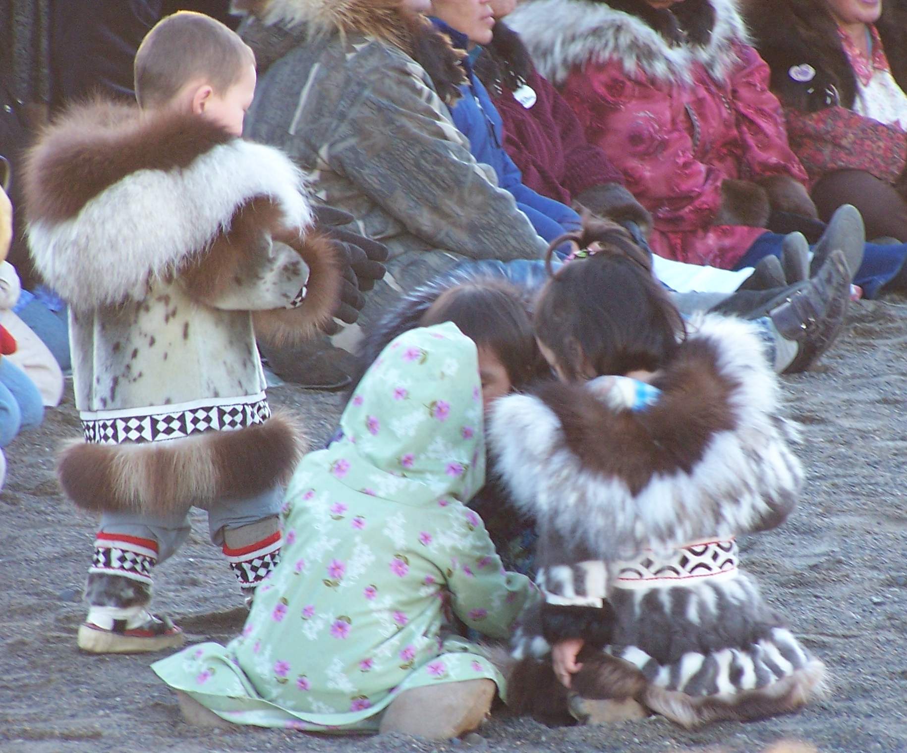 Babies in parkas seen at the Nalukataq, the annual outdoor festival, where each whaling crew that caught a whale the past spring serves a “banquet” of Native food to everyone who comes. Barrow, Alaska.