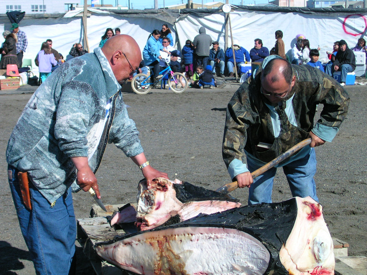 Cutting up a raw section of a whale at the Nalukataq, the annual outdoor festival, where each whaling crew that caught a whale the past spring serves a “banquet” of Native food to everyone who comes. Barrow, Alaska.