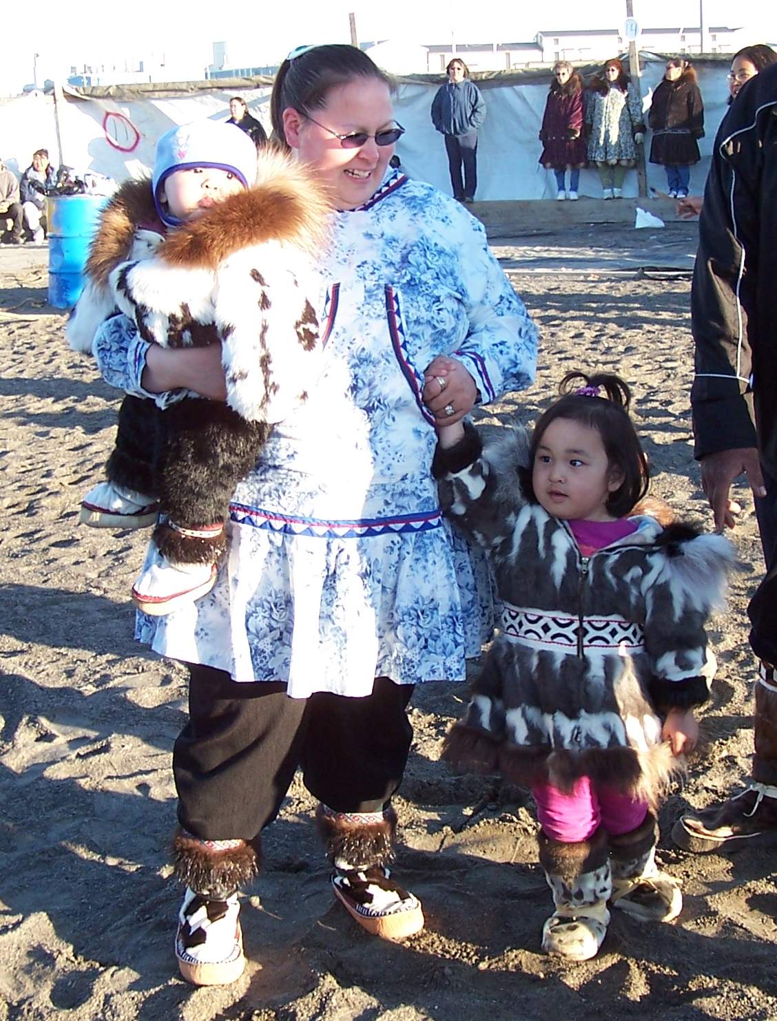 An Inupaiq women and two small girls watch the festivities at the Nalukataq, the annual outdoor festival, where each whaling crew that caught a whale the past spring serves a “banquet” of Native food to everyone who comes. Barrow, Alaska.
