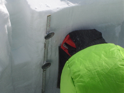 Measuring and examining layers of snow in a snow pit at Summit, Greenland.