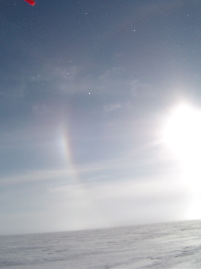 A sun dog or parhelion caused by the refractions of light by ice crystals high in the earth's atmostphere at Summit, Greenland.