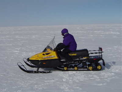 TREC teacher Nikkia Airaudi drives a snowmaching at Summit, Greenland.