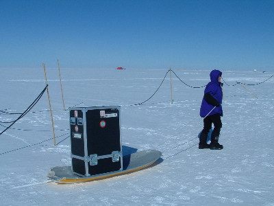 TREC teacher Nikki Airaudi uses a sled to move a skycam at Summit, Greenland.
