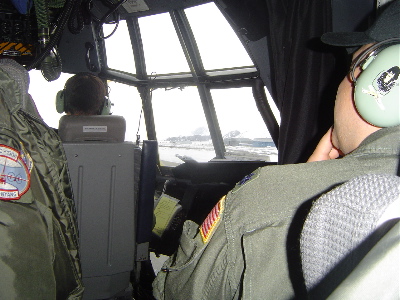 Inside the cockpit of the Herc C-130 transport on the way to Summit, Greenland.