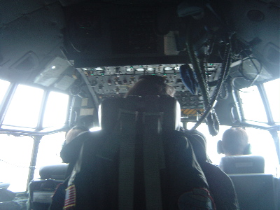 Inside the cockpit of the Herc C-130 transport on the way to Summit, Greenland.