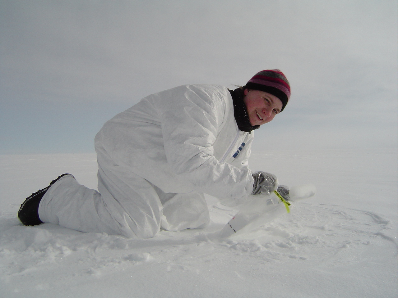 TREC teacher Nikki Airaudi collects snow samples while wearing a clean suit to avoid contaminations. Summit, Greenland.