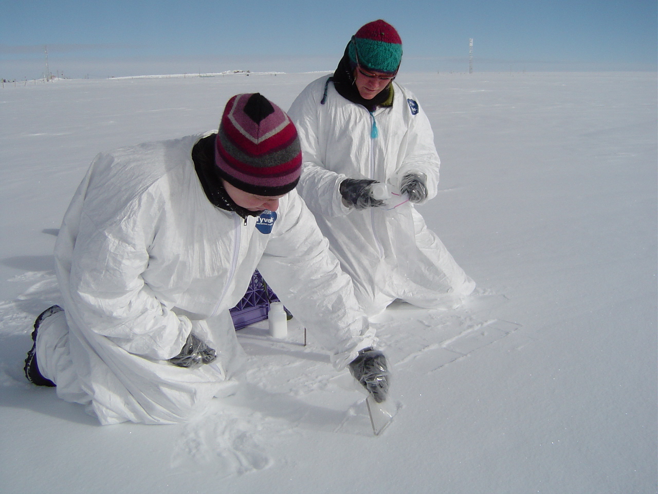 TREC teacher Nikki Airaudi and research technician Meg collect snow samples while wearing clean suits to avoid contaminations. Summit, Greenland.