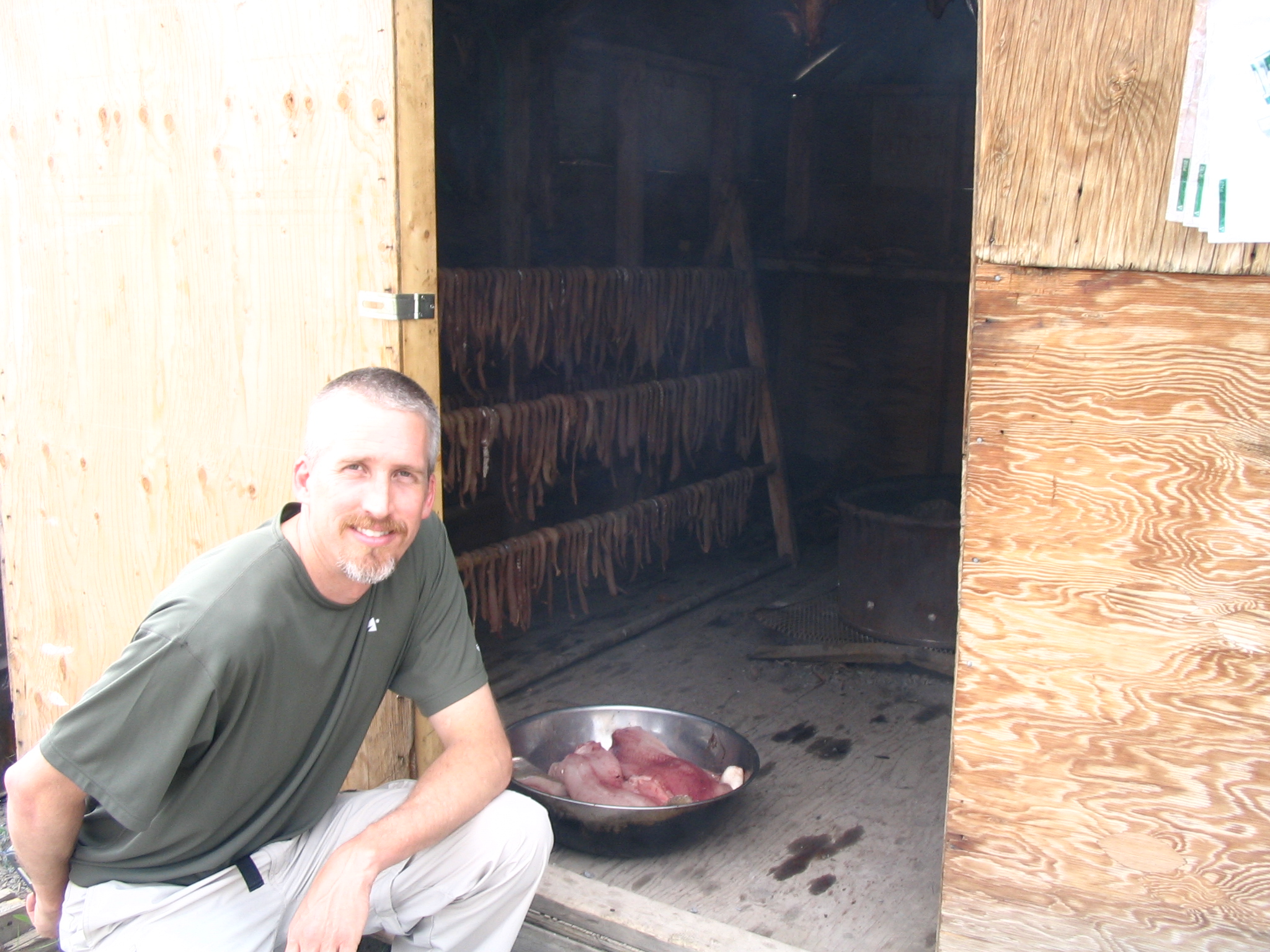 TREC researcher Max Holmes outside of a fish house in Tsiigehtchic, Canada.