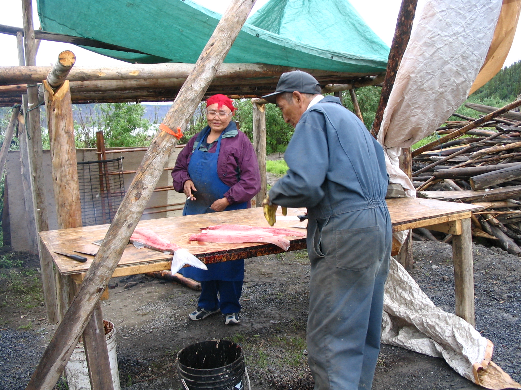Tsiigehtchic native elders Noah and Alice Andre clean fish at their fish camp.