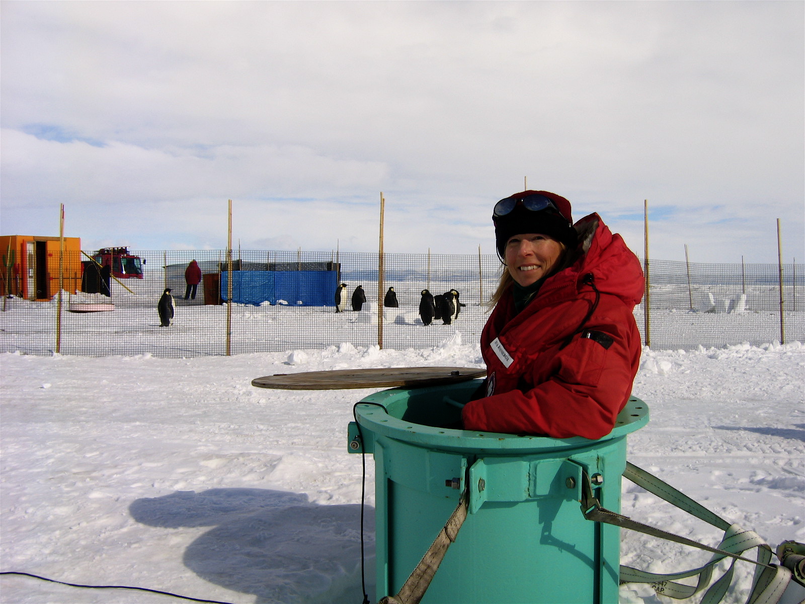 TREC teacher Dena Rosenberger in an observation tube that allows for under-ice observations at the penguin ranch near McMurdo, Antarctica.