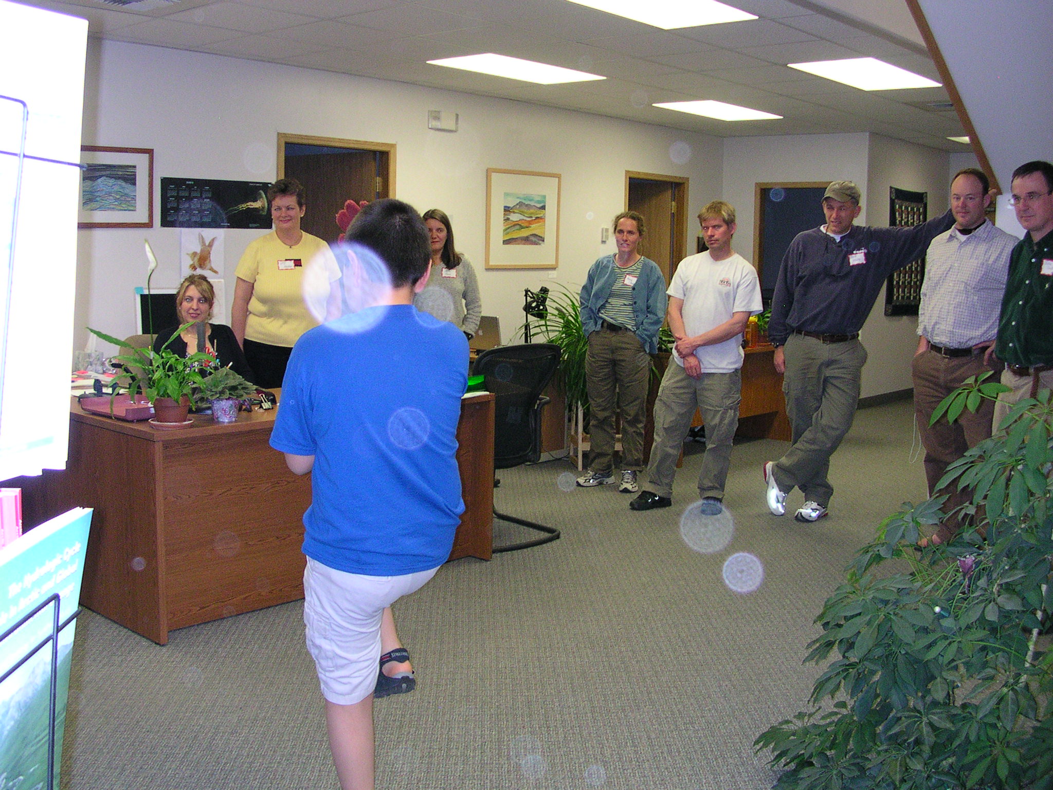 The 2005 TREC teachers are taught a native dance by Sean Topkok and his two sons, Aaron and Christopher, during TREC orientation at the ARCUS office in Fairbanks, AK.