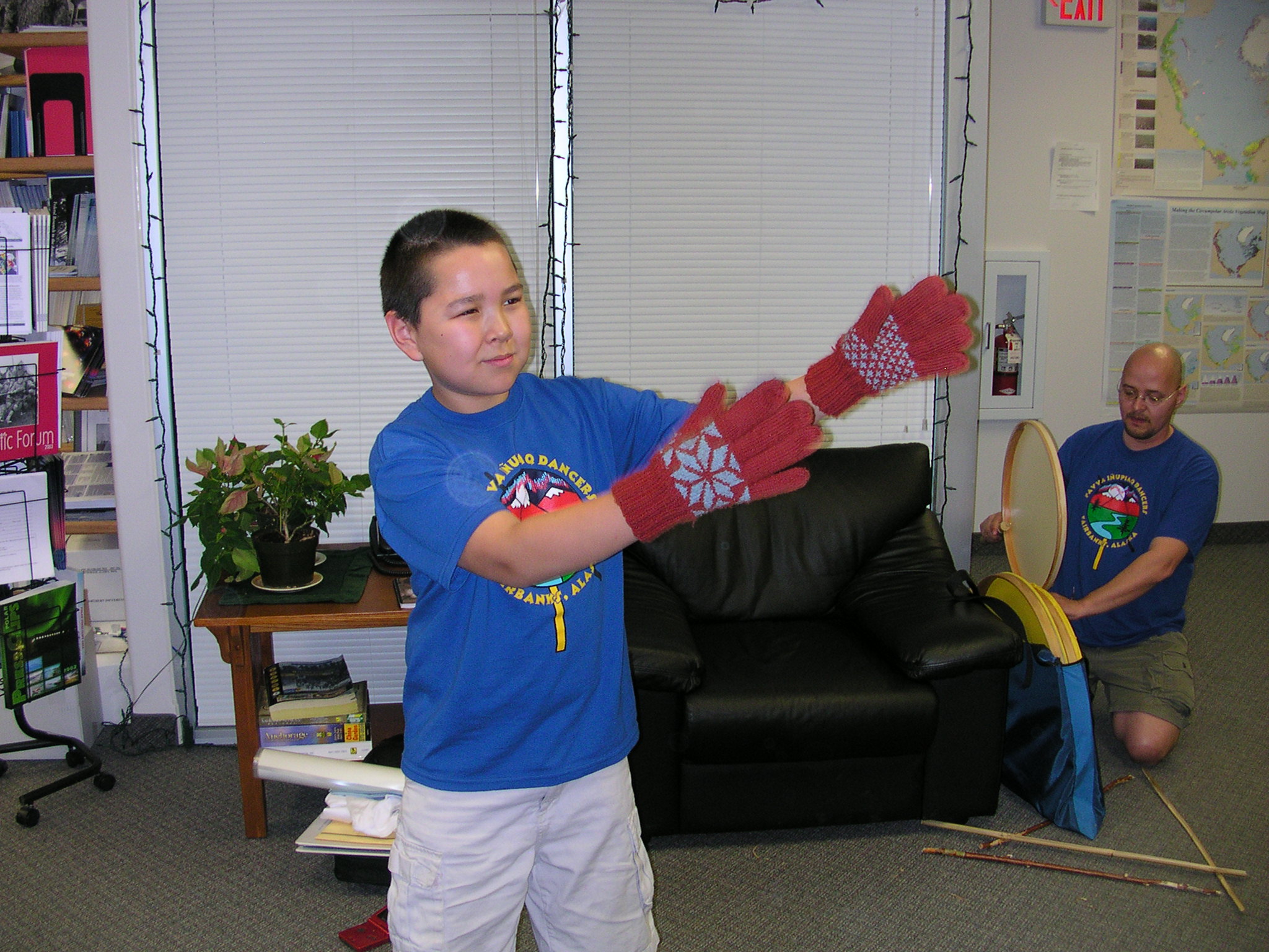 The 2005 TREC teachers are taught a native dance by Sean Topkok and his two sons, Aaron and Christopher, during TREC orientation at the ARCUS office in Fairbanks, AK.
