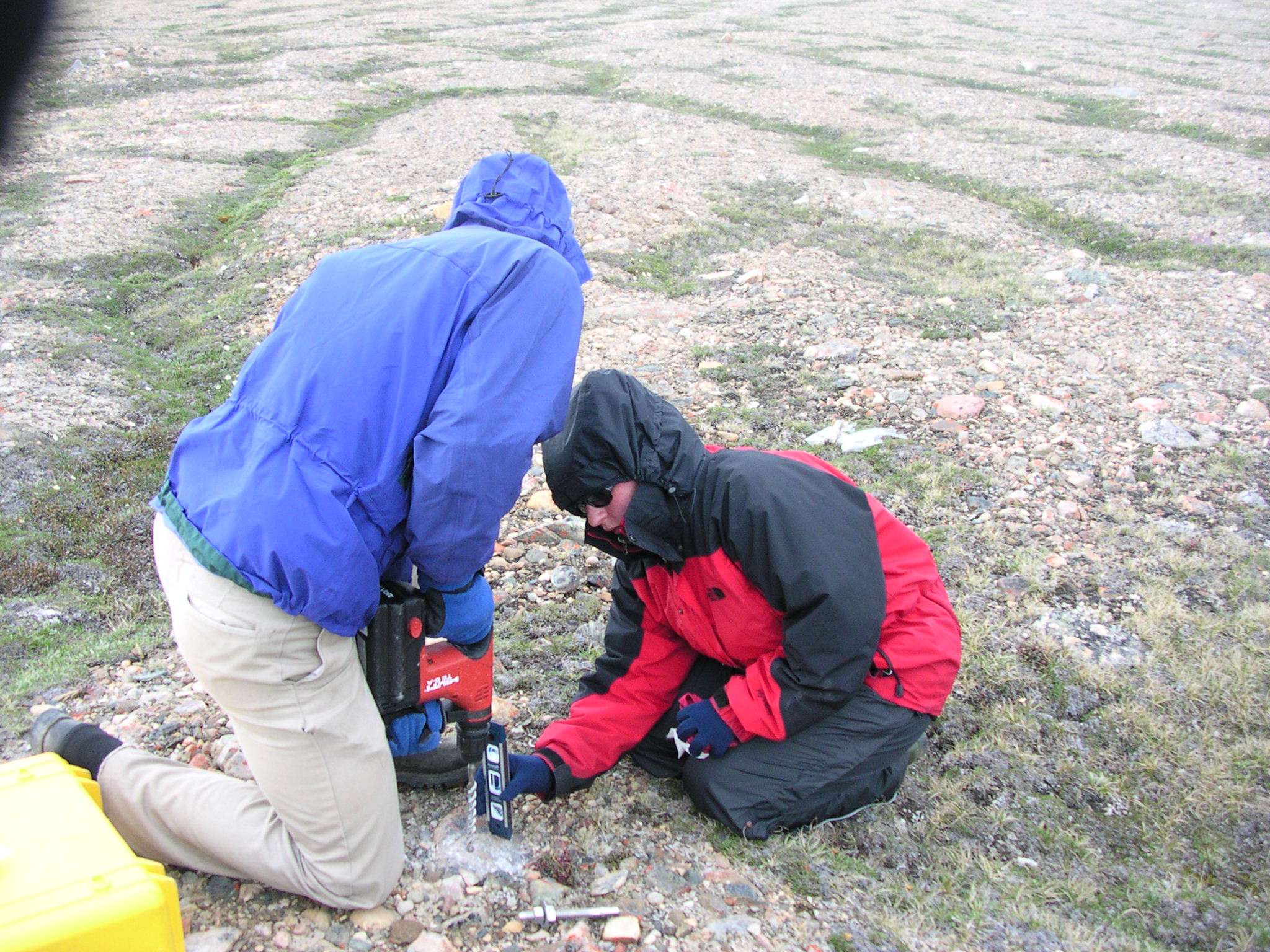 Placing an expansion bolt for a remote sensing antenna near Thule, Greenland.