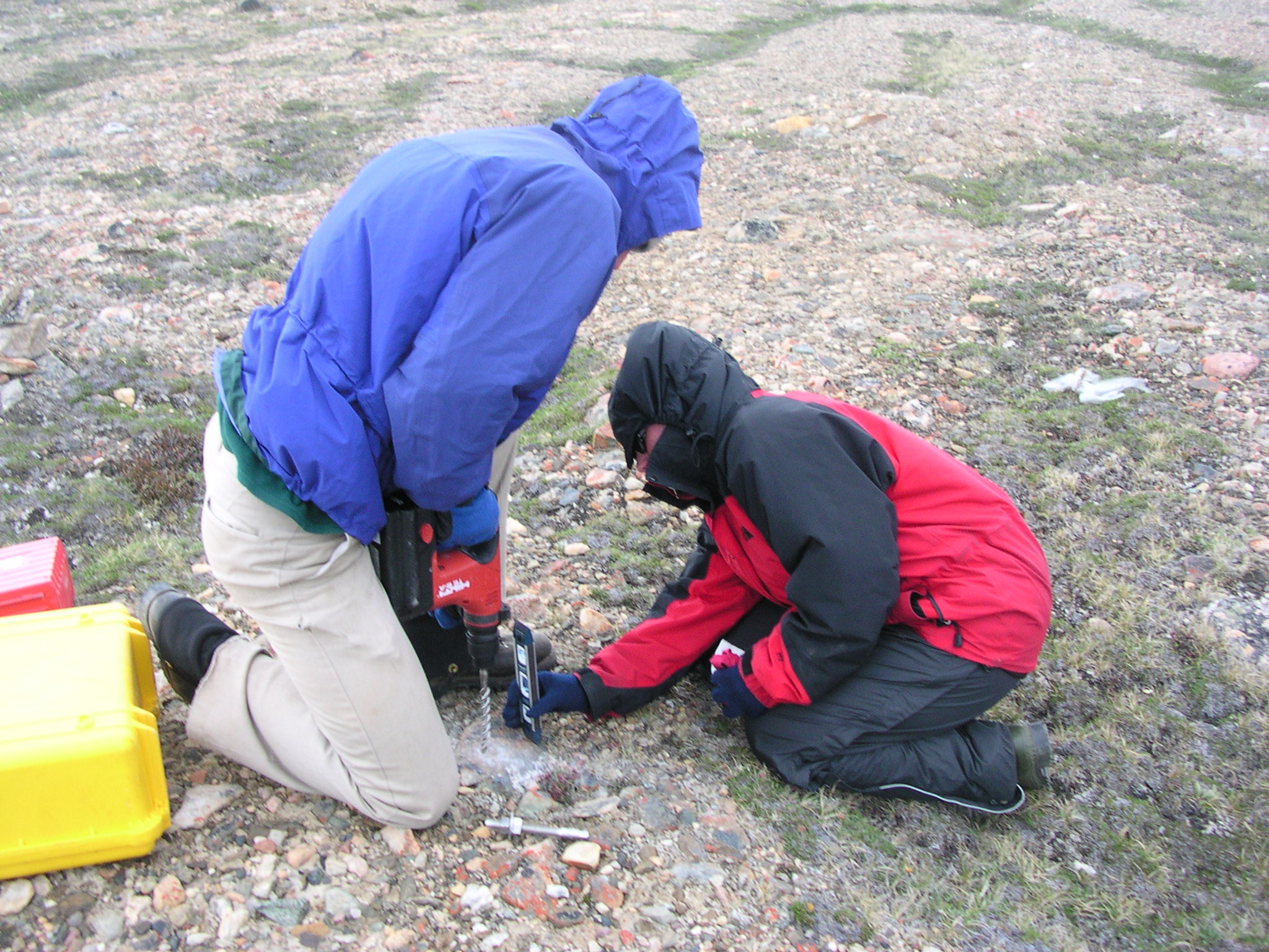 Placing an expansion bolt for a remote sensing antenna near Thule, Greenland.