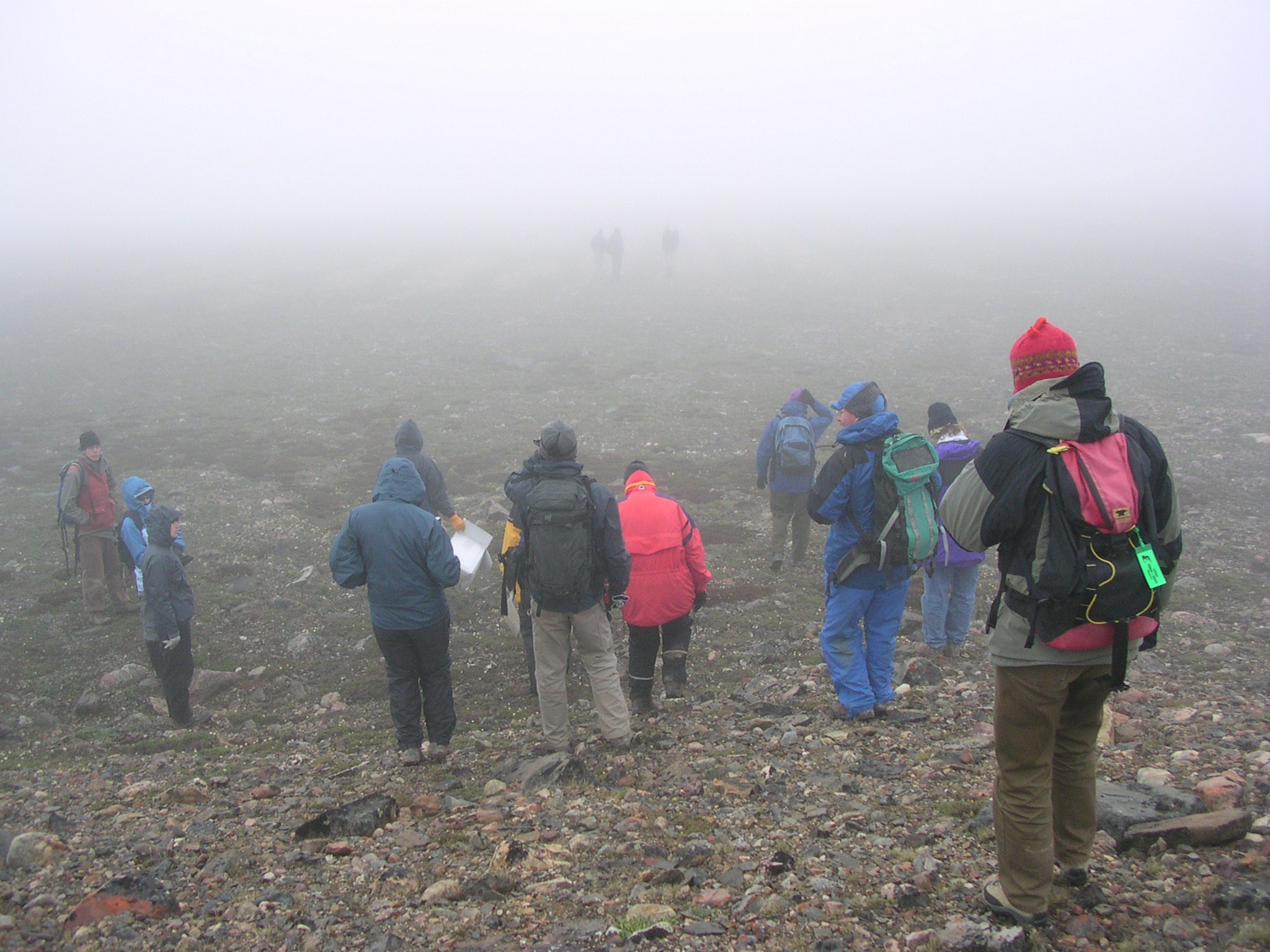 The researcher team hikes in the fog during TREC teacher John Sode's 2005 expedition to Thule, Greenland.