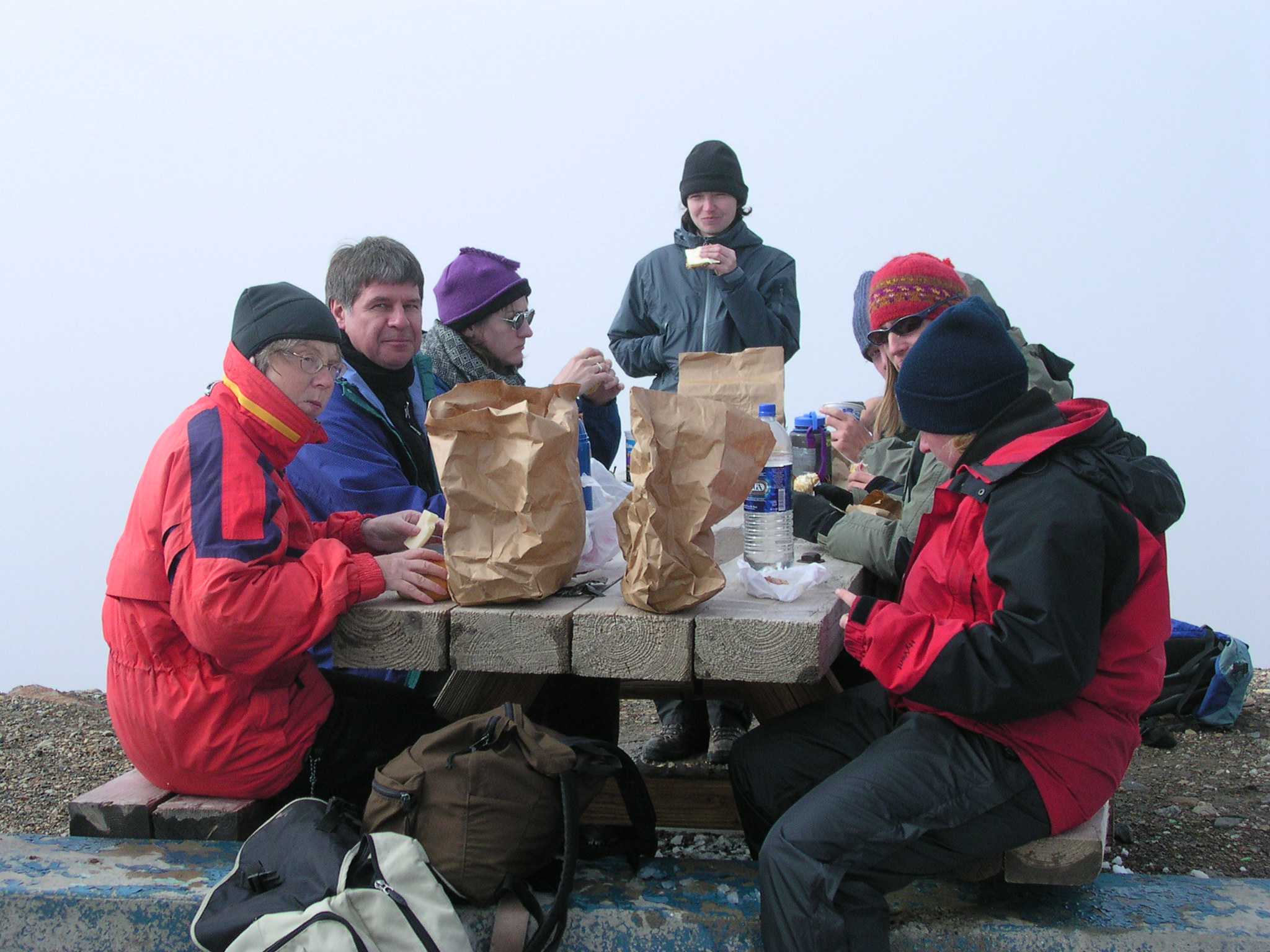 Some of the researcher team enjoys a picnic lunch during TREC teacher John Sode's 2005 expedition to Thule, Greenland.