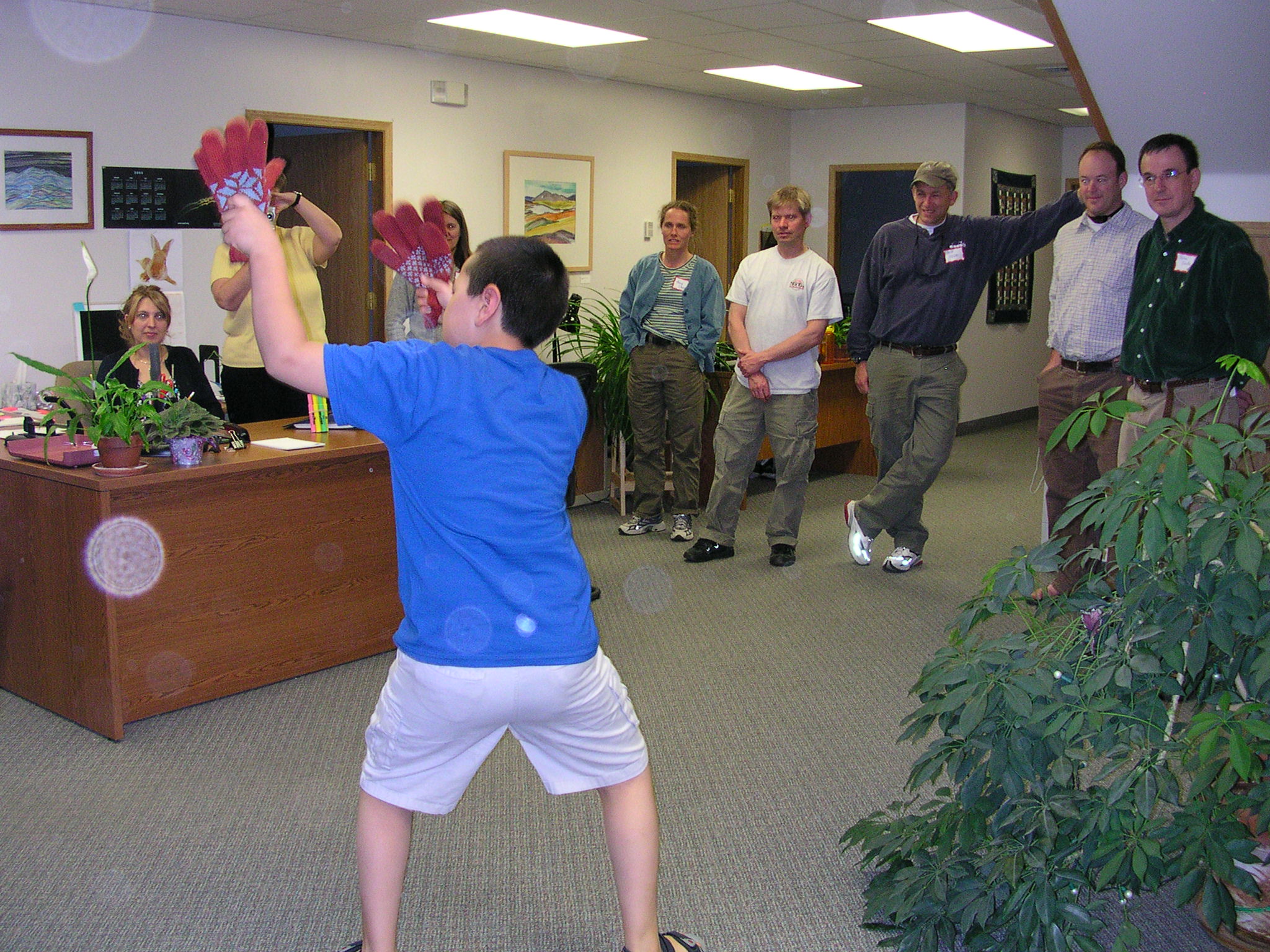 The 2005 TREC teachers are taught a native dance by Sean Topkok and his two sons, Aaron and Christopher, during TREC orientation at the ARCUS office in Fairbanks, AK.