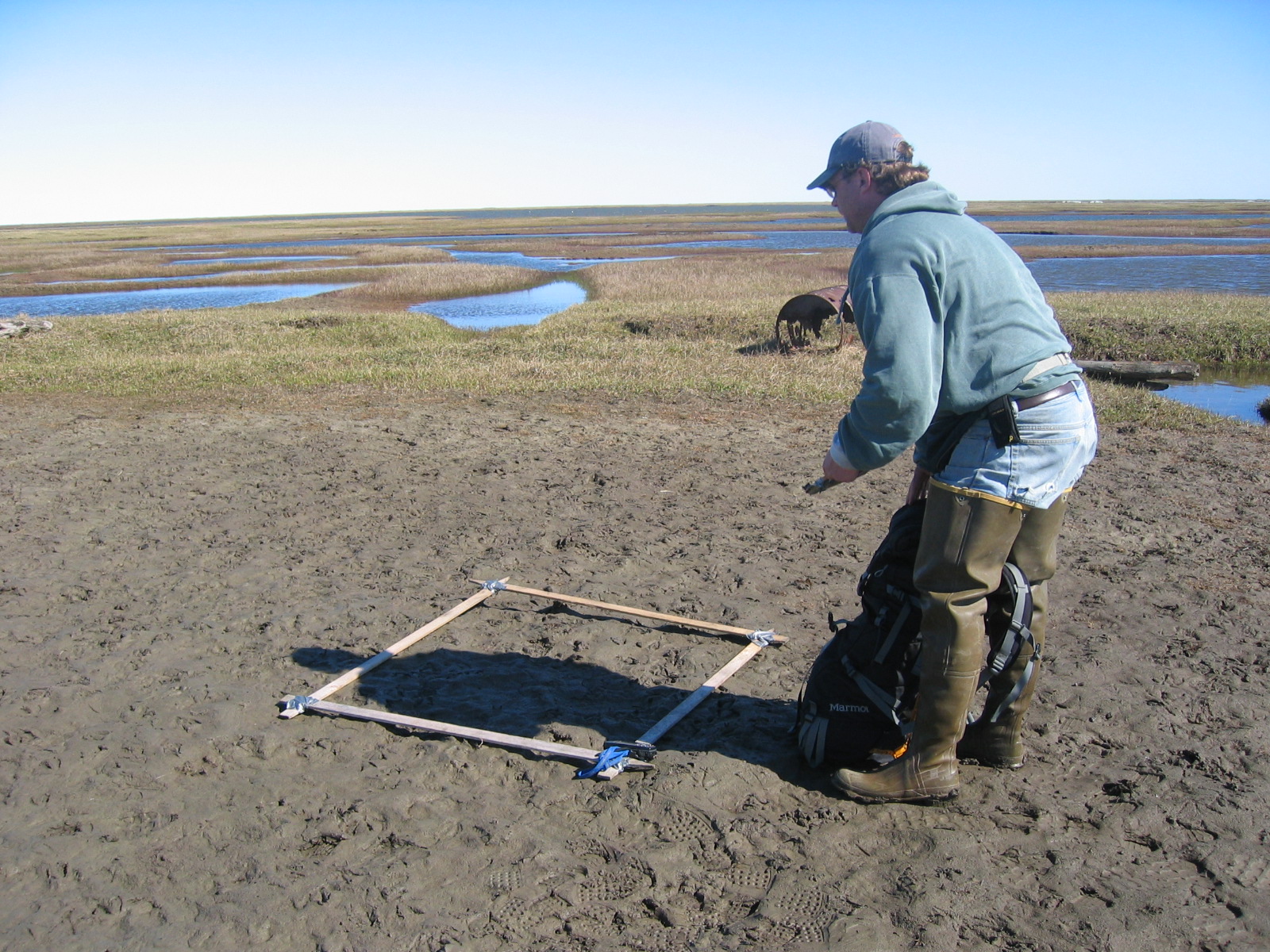 Biologist Brian Person with a large quadrat (1m square box) that he uses to count snow goose (*Chen caerulescens*) feces as part of a snow goose study on the Ikpikpuk Delta.