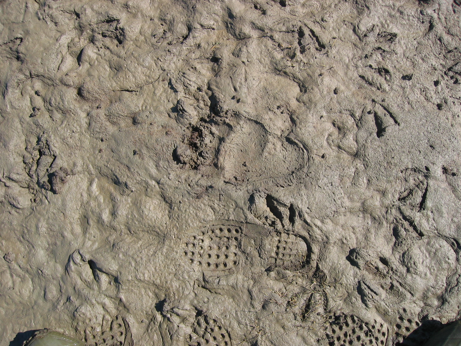 Animal tracks, including a bear track, seen in the mud of the Ikpikpuk Delta.