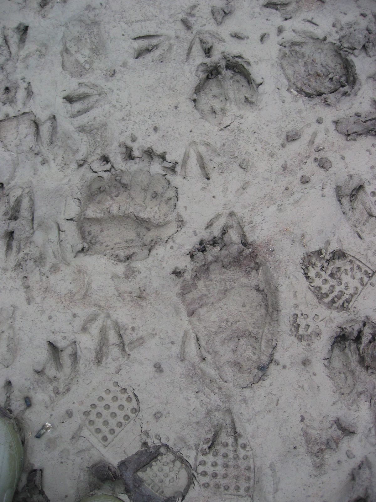 Animal tracks, including bear and goose tracks, seen in the mud of the Ikpikpuk Delta, near Barrow, Alaska.